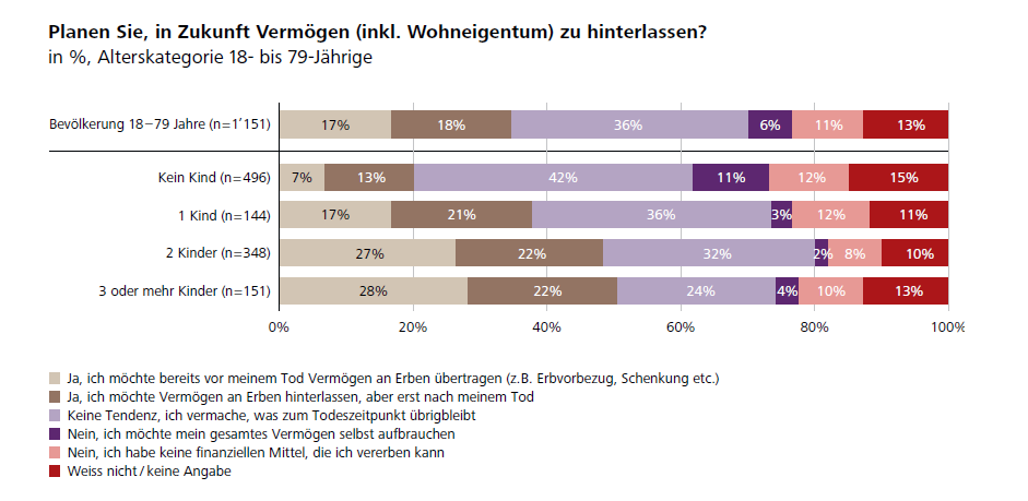 35 Prozent der Befragten gehen davon aus, in Zukunft eine Erbschaft oder einen Erbvorbezug zu erhalten. Von den 18- bis 30-Jährigen würde etwas mehr als ein Drittel (35%) einen Erbvorbezug favorisieren und 14 Prozent sogar erwarten. Je jünger die Befragten, desto wichtiger sind die immobilienbezogenen Motive: 49 Prozent der 18- bis 30-Jährigen würden den Erbvorbezug für die Finanzierung einer eigenen Wohnung oder eines Hauses nutzen und 18 Prozent für die Übernahme des Elternhauses. Bei den 31- bis 50-Jährigen sind dies mit 36 beziehungsweise 15 Prozent bereits weniger. Frank Frey, Co-Leiter Fachzentrum Erbschaftsberatung bei Raiffeisen Schweiz, zu dieser Erkenntnis: «Ein Eigenheim können sich heute viele junge Personen nur noch dank der finanziellen Unterstützung der Eltern leisten. Vermögen weitergeben, damit die Kinder in eigenen vier Wänden leben können, ist auch die Absicht vieler Eltern.» Dem Wunsch der Nachkommen, die finanziellen Mittel dann zu erhalten, wenn sie diese effektiv benötigen, kommen hingegen nur wenige nach. Die grosse Mehrheit der Erblassenden möchte das Vermögen erst nach dem Tod weitergeben. Lediglich 17 Prozent der Befragten planen einen Erbvorbezug oder eine Schenkung zu machen. Die Umfrage zeigt weiter, dass die Absicht, Vermögen frühzeitig zu vererben, stark von der Anzahl Kinder abhängt. Mehr als ein Viertel der Befragten mit zwei oder mehr Kindern sagen, dass sie schon vor dem Tod einen Teil des Erbes weitergeben möchten. Bei Personen mit einem Kind sind es 17 Prozent und bei kinderlosen Personen gar nur sieben Prozent.