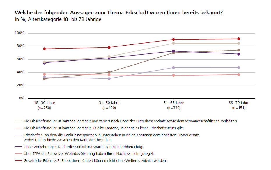Die Befragung zeigt, dass mit zunehmendem Alter das Wissen über das Thema Erbschaft steigt. So weiss beispielsweise die grosse Mehrheit der über 50-Jährigen, dass es bei der Erbschaftssteuer kantonale Unterschiede gibt und die Steuer sowohl vom Verwandtschaftsgrad als auch von der Höhe des vererbten Vermögens abhängt. Grosse Wissenslücken gibt es beim Konkubinat. Nur knapp die Hälfte (47%) der Personen über 50 Jahren weiss, dass Konkubinatspartnerinnen und -partner in vielen Kantonen dem höchsten Erbschaftssteuersatz unterliegen. Bei der jüngsten Alterskategorie der 18- bis 30-Jährigen ist dies lediglich einem Drittel bekannt. Auch wissen 35 Prozent der 18- bis 30-Jährigen und ein Viertel der 31- bis 50-Jährigen nicht, dass sich Konkubinatspaare im Testament oder Erbvertrag gegenseitig begünstigen müssen, um überhaupt erbberechtigt zu sein. Bei den über 50-Jährigen ist dies für deutlich weniger als 20 Prozent ein Fragezeichen. «Fehlendes Wissen birgt in solchen Lebenskonstellationen ganz klar grosse Risiken, da nicht rechtzeitig entsprechende Vorkehrungen getroffen werden», sagt Dr. Jürg Portmann, Co-Leiter Institut für Risk & Insurance an der ZHAW School of Management and Law.