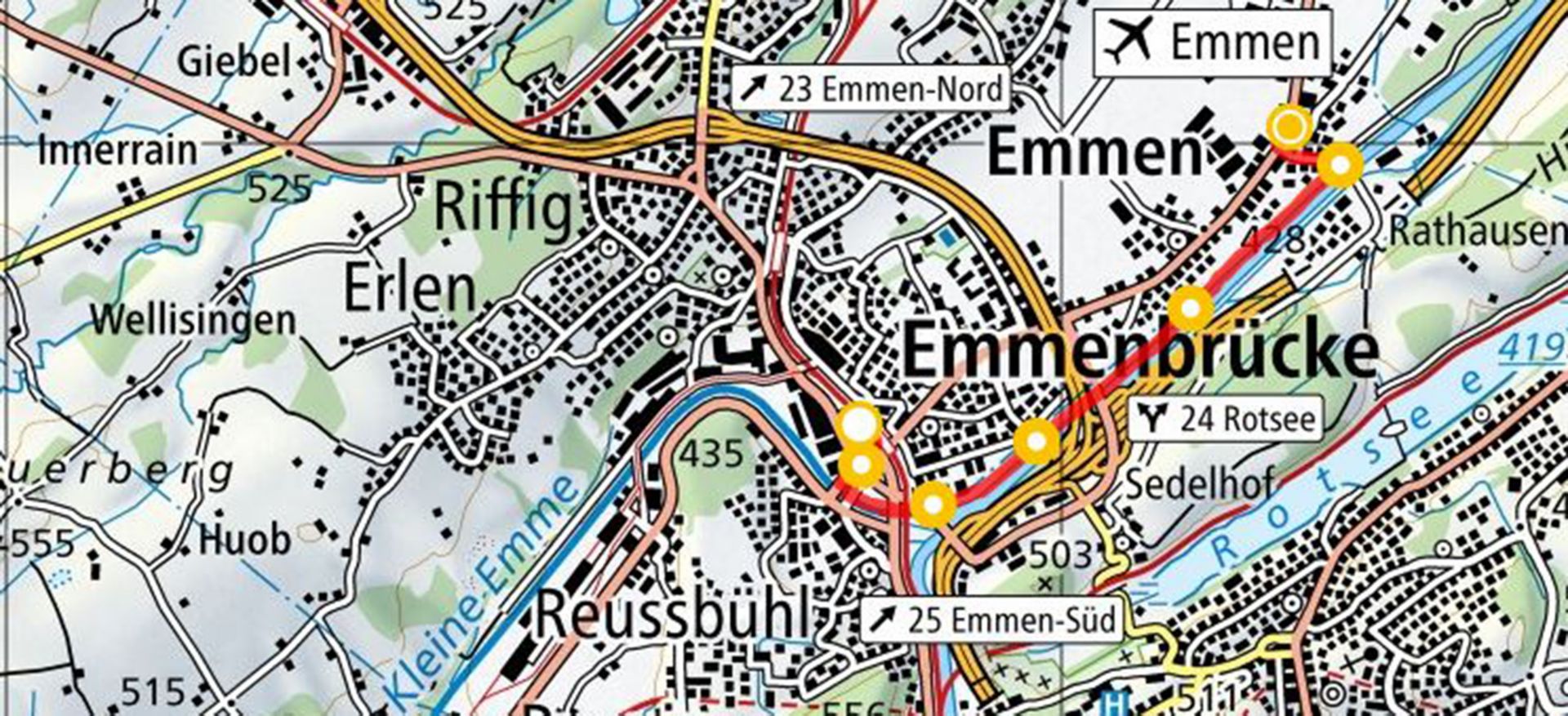 Der Startposten befindet sich bei der Bushaltestelle Emmen Allmendli, direkt vor der Autogarage. Folge den Sumsi-Pfeilen bis zur Reuss und folge dann dem Wanderweg flussaufwärts.