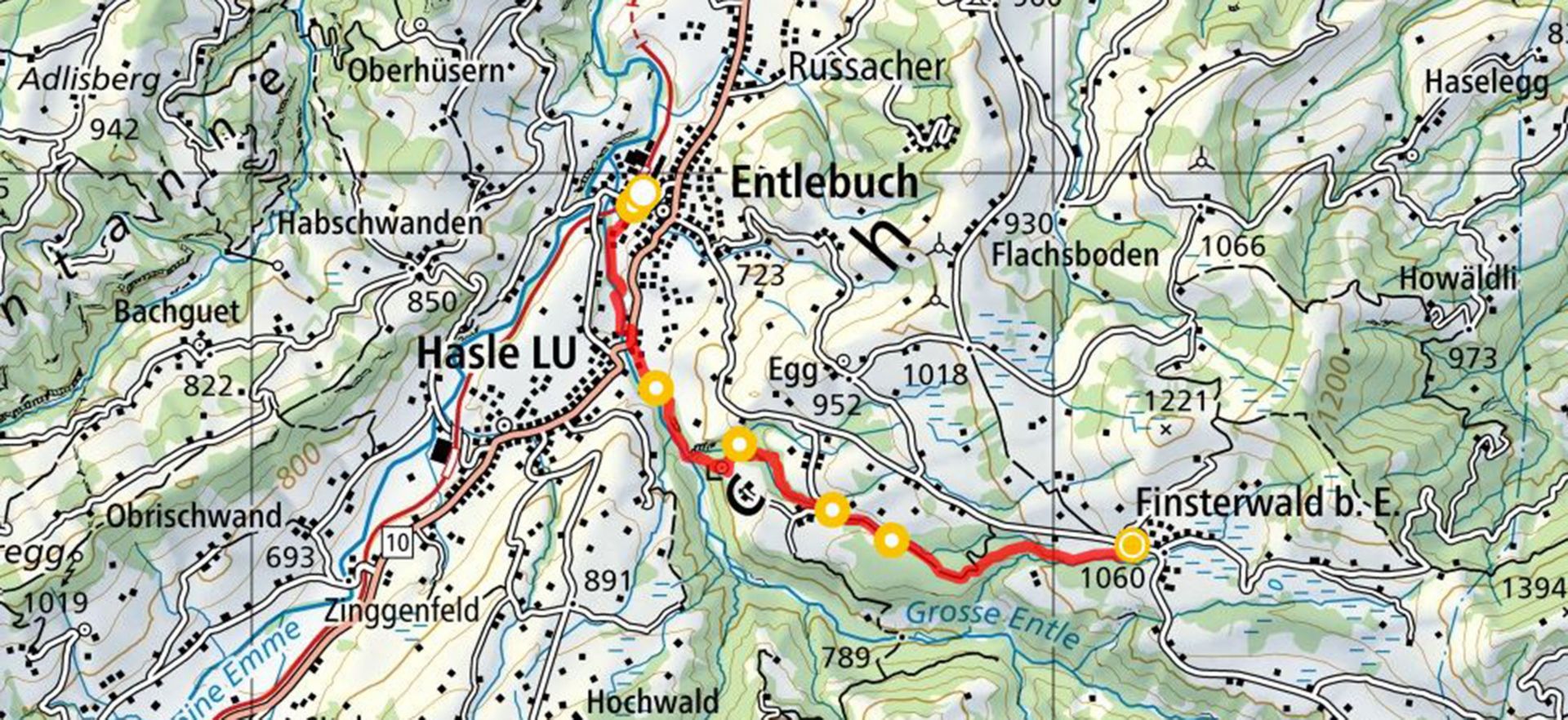 Der Startposten befindet sich bei den Wegweisern gegenüber der Postautohaltestelle vor der Kirche. Folge der Beschilderung in Richtung Burggrabe und Entlebuch.