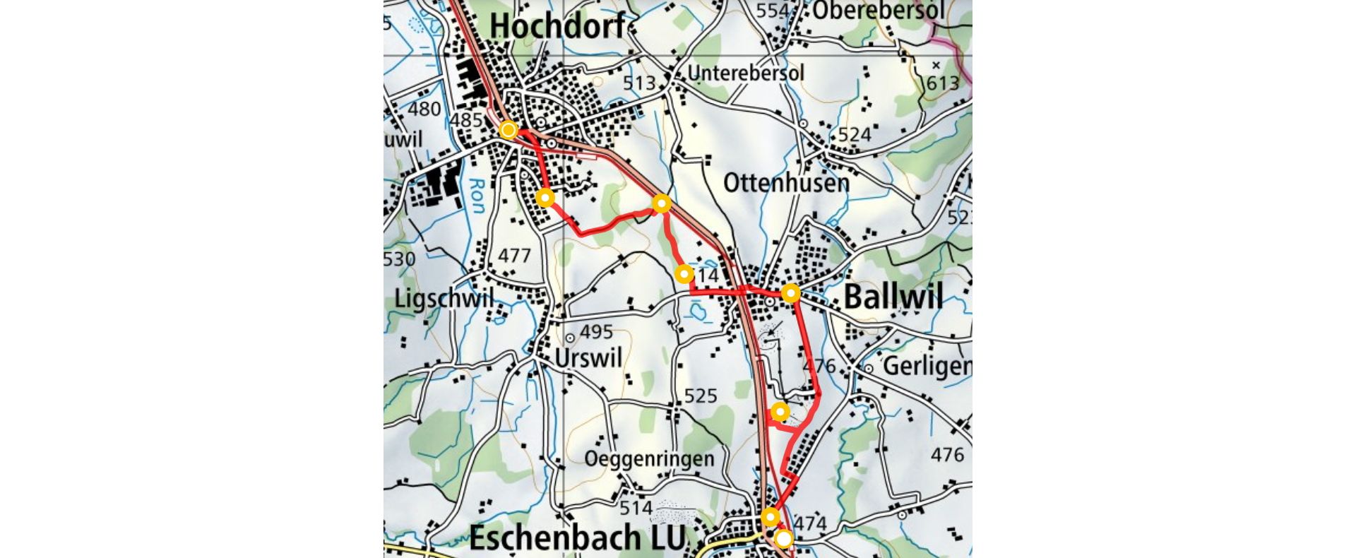 Der Startposten befindet sich bei den Wegweisern an der Hauptstrasse oberhalb vom Bahnhof und der Bushaltestelle. Folge anschliessend den Wegweisern Richtung Ballwil oder Luzern.