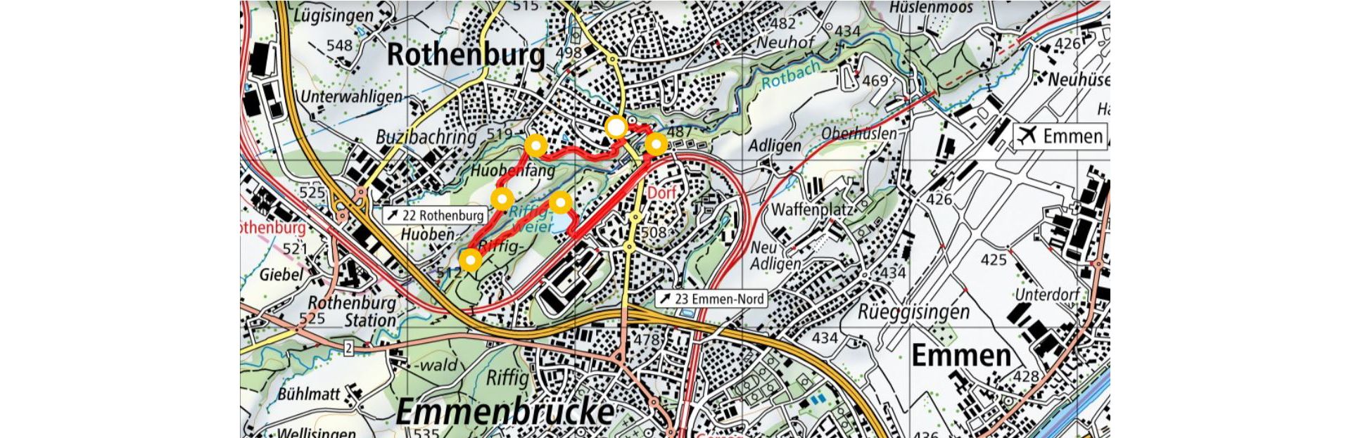 Der Startposten befindet sich bei den Wegweisern auf dem Platz beim Flecken, direkt bei der Bushaltestelle. Dann der Beschilderung Richtung Neuenkirch und Sursee folgen.