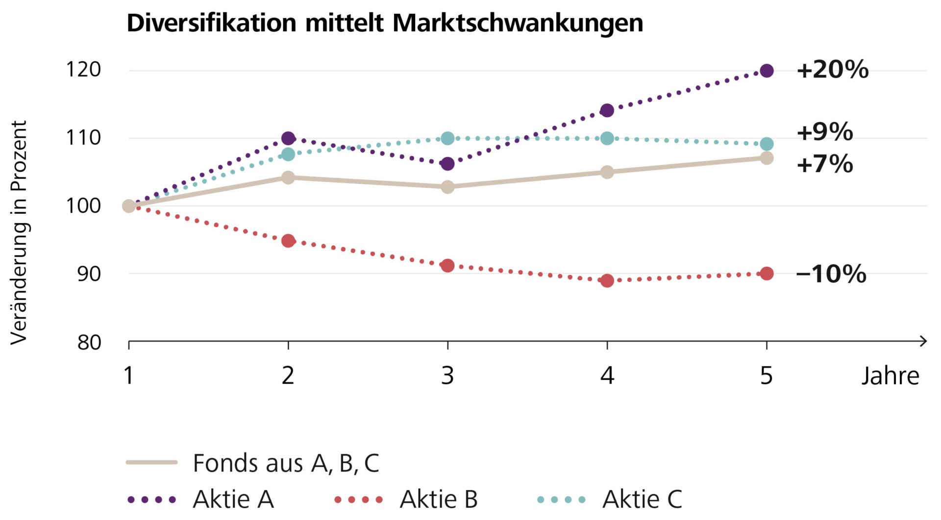 Anlegerin Klara investiert 100 Franken in einen Fonds, der Anteile an den Aktien A, B und C hält. Nach 5 Jahren hat sie einen mittleren Gewinn von 7 Prozent erzielt. Zwar ist ihr damit eine grössere Renditechance entgangen, sie hat aber auch einen schmerzhaften Verlust verhindert.