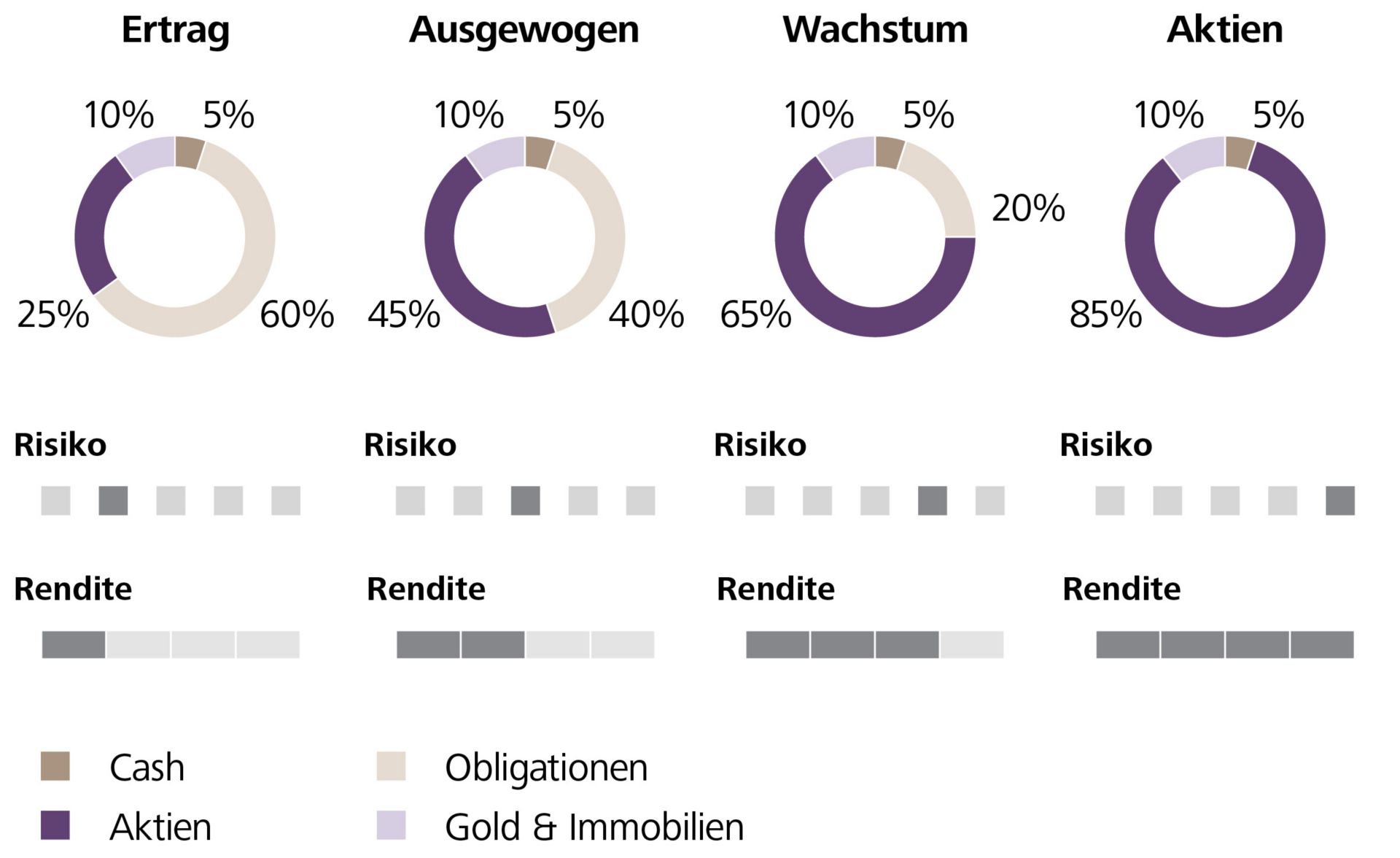 Die «Strategy Invest» Fonds von Raiffeisen sind auf unterschiedliche Risikoprofile zugeschnitten und bieten Orientierung für Ihre persönliche Diversifikations-Strategie. Wenn Sie sicher und mit wenig Risiko investieren wollen, eignet sich ein Portfolio, das einen Schwerpunkt auf Obligationen legt (60 Prozent) und Titel enthält, die zu 80 Prozent in Schweizer Franken gehandelt werden. Das gilt als konservative Anlagestrategie.