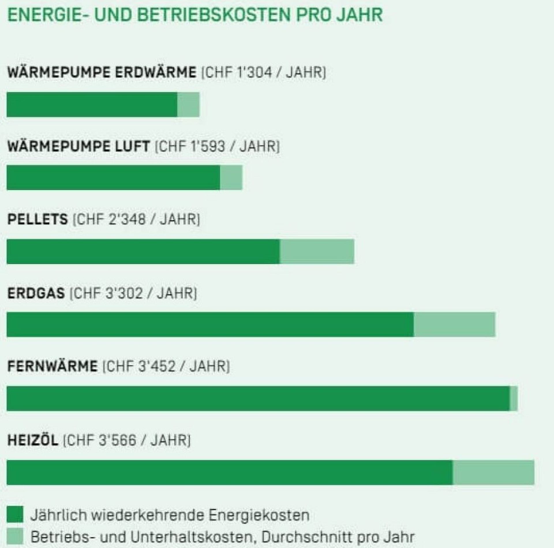 Wenn beispielsweise in einem 170m2 grossem, fossil beheizten Eigenheim der jährliche Ölverbrauch bei 2'500 Liter liegt, kostet dies die darin wohnende Familie ca. CHF 3'500.- pro Jahr. Wird das gleiche Gebäude mit einer Wärmepumpe beheizt, liegen die Kosten nur noch bei CHF 1'304 pro Jahr – also 2/3 günstiger. Mit unserem Kostenbeispiel erhalten Sie einen ersten Überblick, wie sich dies mit den verschiedenen Systemen verhält: