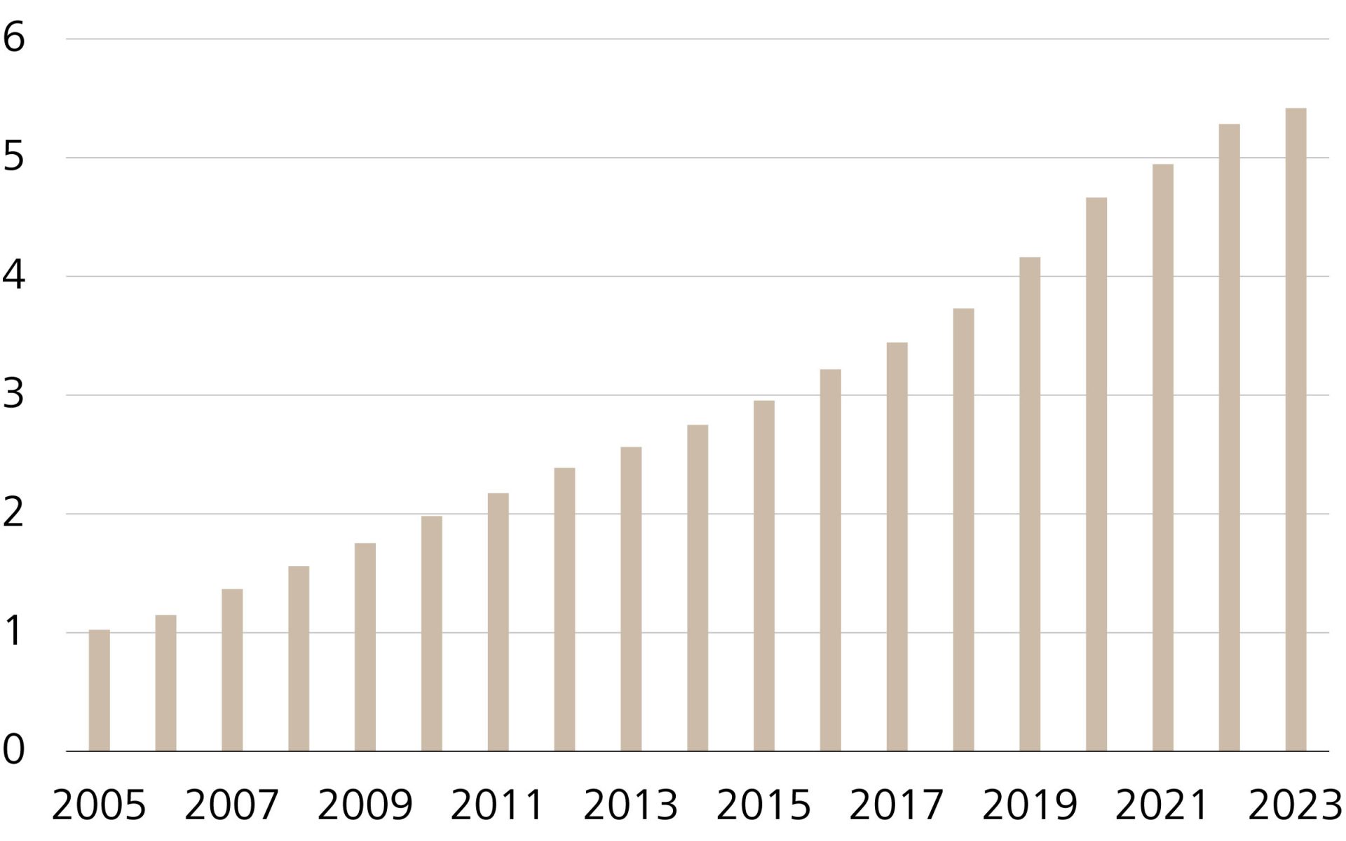 Rien qu’au cours de ces dix dernières années, le pourcentage de personnes utilisant Internet a plus que doublé. Désormais, deux personnes sur trois dans le monde ont accès à Internet. En particulier dans les pays en voie de développement, où le taux de pénétration n’est pas encore aussi élevé, il reste un immense potentiel de digitalisation, qui ne tardera pas à se déployer dans les années à venir.