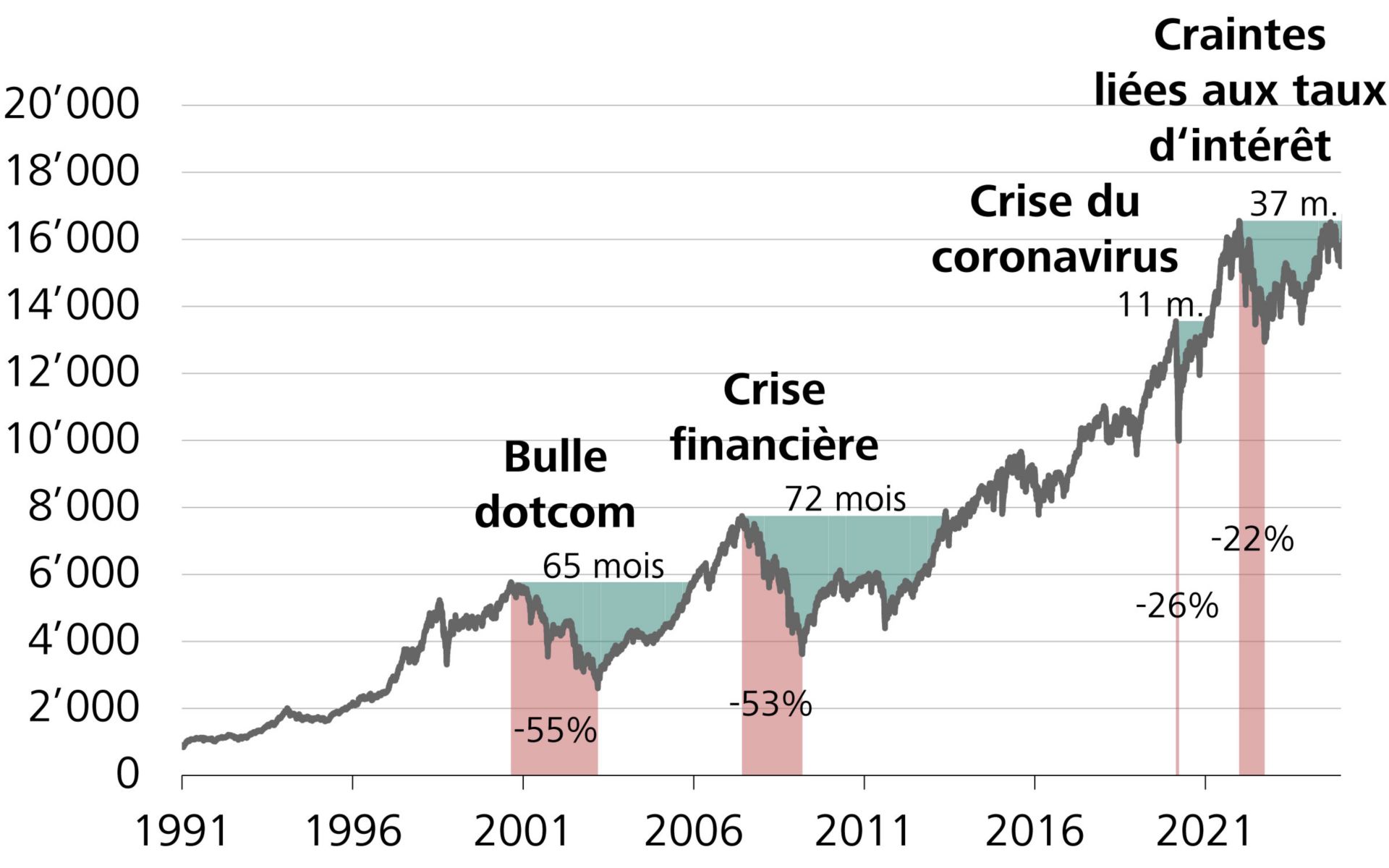 Une observation à long terme du marché suisse des actions (SPI) montre que les investisseurs ont pu réaliser des gains en capital au cours des 30 dernières années, malgré des revers répétés comme l’éclatement de la bulle dotcom au début des années 2000 (-55%) ou la crise financière de 2008 (-53%).