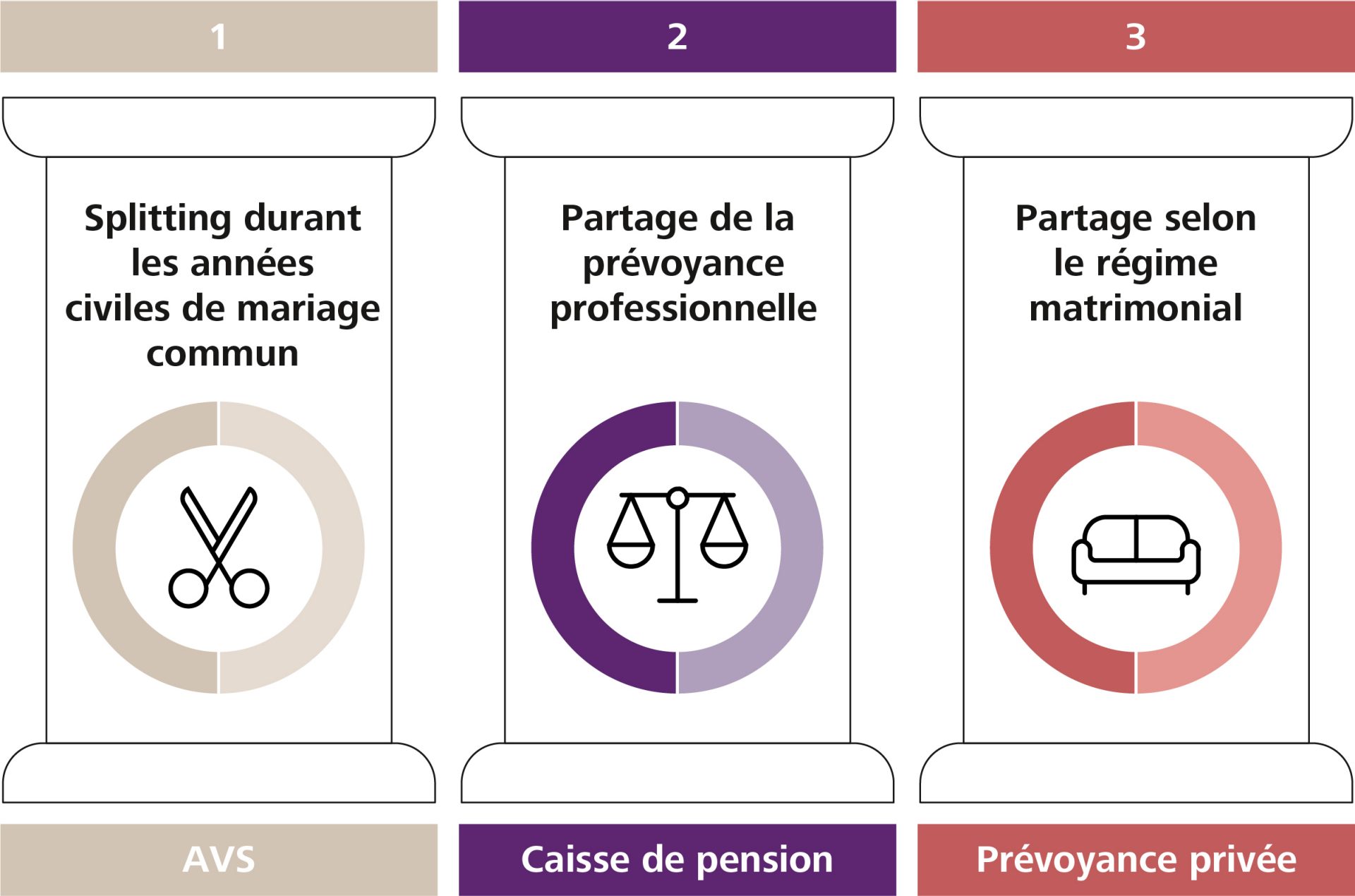 Pour la caisse de pension (le 2e pilier), on applique ce que l’on appelle le «partage de la prévoyance». Cela signifie que les avoirs de caisse de pension accumulés pendant le mariage sont répartis au jour près. Il n’est pas possible de contourner cette répartition par un contrat de mariage ou d’autres dispositions contractuelles. Une exception existe s’il est prouvé que des rachats volontaires ont été effectués pendant le mariage avec du patrimoine provenant des biens propres – ceux-ci ne sont alors pas pris en compte. Depuis 2017, le partage a également lieu si l’un des époux était déjà retraité ou invalide à la date du divorce.