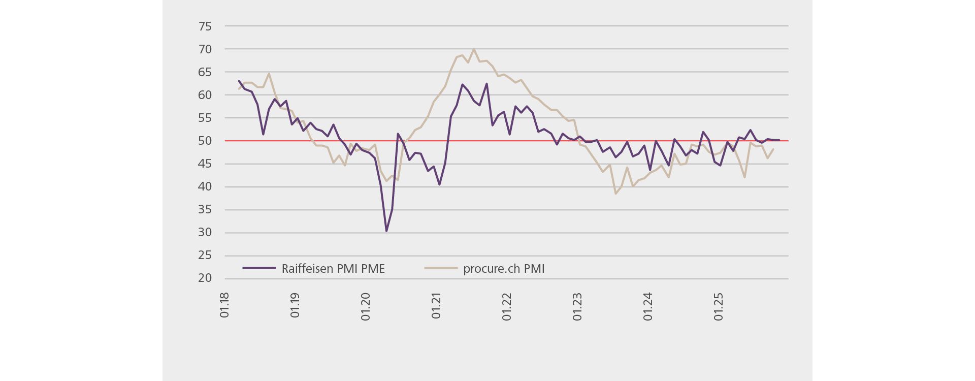 Dans l’ensemble, le nombre de PME faisant état d’une amélioration de leur situation économique est à peu près le même que celui faisant état d’une détérioration. La stabilité continue toutefois de reposer principalement sur les entreprises industrielles opérant sur le marché suisse. Les entreprises signalant une baisse de leur activité prédominent parmi les PME exportatrices. Les résultats du Raiffeisen PMI PME sont donc similaires à ceux de l’indice des directeurs d’achat de procure.ch, qui mesure principalement la situation commerciale des grandes entreprises.
