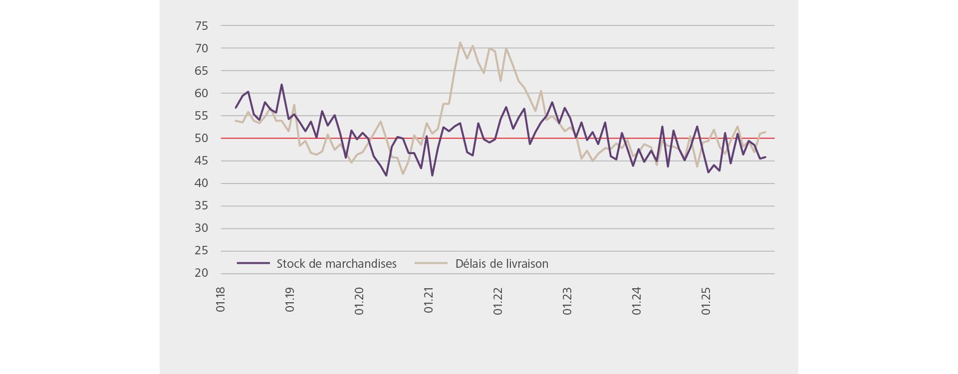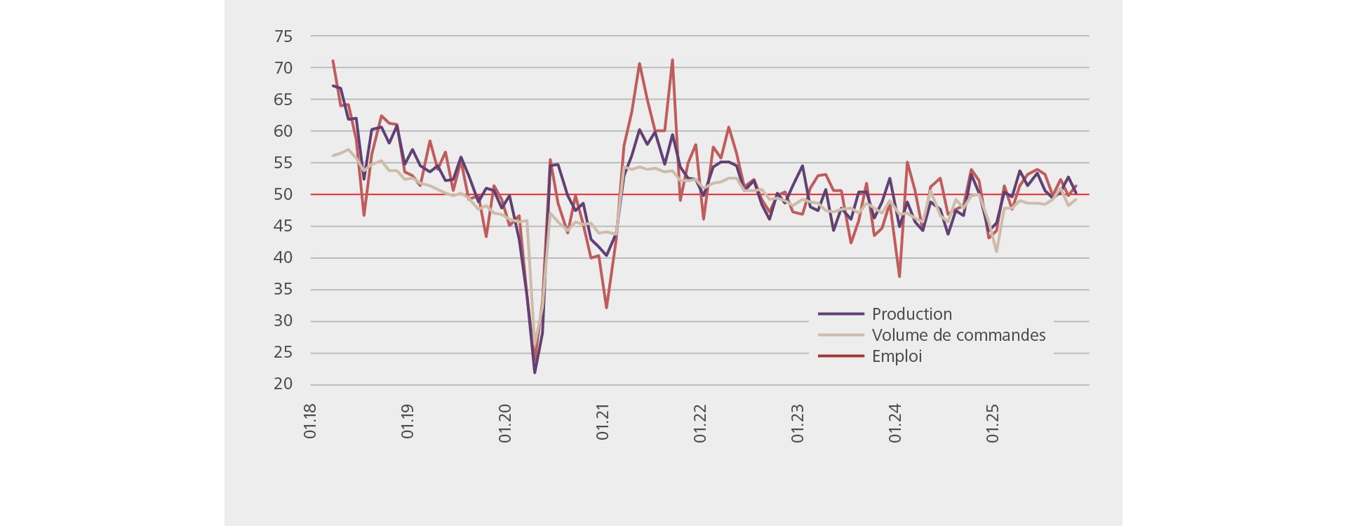 L’indice Raiffeisen PMI PME est passé de 50,5 à 50,2 points en octobre. La situation économique des petites et moyennes entreprises du secteur industriel est donc restée pratiquement inchangée par rapport au mois précédent. Certains éléments de l’évolution de l’activité ont toutefois connu des changements parfois nets. En septembre, la composante production a progressé de 50,5 à 53,0 points en raison de la hausse du volume des commandes. Cette évolution positive des carnets de commandes ne s’est toutefois pas poursuivie en octobre: la composante correspondante a chuté de 52,6 à 50,0 points, ce qui indique l’absence d’autres impulsions de production. Après une augmentation surprenante le mois précédent, le niveau de l’emploi a quant à lui reculé. La composante de l’emploi a diminué de 51,1 à 48,3 points. En revanche, l’allongement des délais de livraison est positif: la composante correspondante a progressé de 47,0 à 51,2 points, ce qui indique une meilleure utilisation des capacités de production. La composante des stocks a au contraire chuté de 48,7 à 45,6 points et se situe ainsi sous le seuil de croissance de 50 pour le quatrième mois consécutif, signal d’une demande toujours modérée.