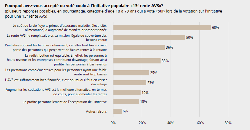 Pour 68% des personnes qui ont glissé un «oui» dans l’urne lors de la votation sur la 13e rente AVS en mars dernier, l’augmentation disproportionnée du coût de la vie, comme les loyers, les primes d’assurance-maladie, l’électricité et les denrées alimentaires, a été une raison de leur vote. La moitié des partisans estimaient que la rente AVS ne répondait plus au mandat légal qui est de couvrir les besoins vitaux et un peu plus d’un tiers (36%) ont été incités à accepter l’initiative par l’argument selon lequel celle-ci soutenait particulièrement les femmes. «Beaucoup de gens ne semblent pas être conscients du fait que les rentes AVS sont adaptées tous les deux ans à l’évolution des salaires et des prix. La prochaine adaptation sera de 2,9% pour le 1er janvier 2025», explique Jürg Portmann, co-directeur de l’Institut Risk & Insurance à la ZHAW School of Management and Law. Près d’un quart (23%) a fait référence à la position souvent entendue avant la votation, selon laquelle l’AVS est suffisamment bien financée pour augmenter les versements.