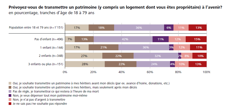 Parmi les personnes sondées, 35% pensent recevoir un héritage ou une avance d’hoirie dans le futur. Dans la tranche d’âge de 18 à 30 ans, un peu plus d’un tiers (35%) préféreraient une avance d’hoirie et 14% comptent même sur cette forme de transmission. Plus les personnes interrogées sont jeunes, plus les motivations liées à l’immobilier sont importantes: 49% des personnes de 18 à 30 ans utiliseraient l’avance d’hoirie pour financer l’acquisition de leur propre appartement ou maison et 18% pour reprendre la maison de leurs parents. Entre 31 et 50 ans, ces proportions sont déjà inférieures, avec respectivement 36% et 15%. Frank Frey, codirecteur du centre spécialisé Conseil en matière successorale chez Raiffeisen Suisse, affirme à ce propos: «Aujourd’hui, de nombreux jeunes ne peuvent s’offrir leur propre logement que grâce au soutien financier de leurs parents. De même, de nombreux parents prévoient de transmettre leur patrimoine pour que leurs enfants puissent vivre dans leur propre logement.» En revanche, rares sont ceux qui parviennent à répondre au souhait de leurs descendants de recevoir ces moyens financiers au moment où ils en ont réellement besoin. La grande majorité des disposants ne souhaitent transmettre leur patrimoine qu’après leur décès. Seuls 17% des personnes interrogées envisagent d’octroyer une avance d’hoirie ou une donation. L’enquête révèle également que l’intention de léguer un patrimoine de manière anticipée dépend fortement du nombre d’enfants. Plus d’un quart des personnes interrogées ayant deux enfants ou plus déclarent en effet qu’elles souhaitent transmettre une partie de leur héritage avant leur décès, tandis que ce chiffre ne dépasse pas 17% parmi les personnes ayant un seul enfant, voire 7% parmi les personnes sans enfants.