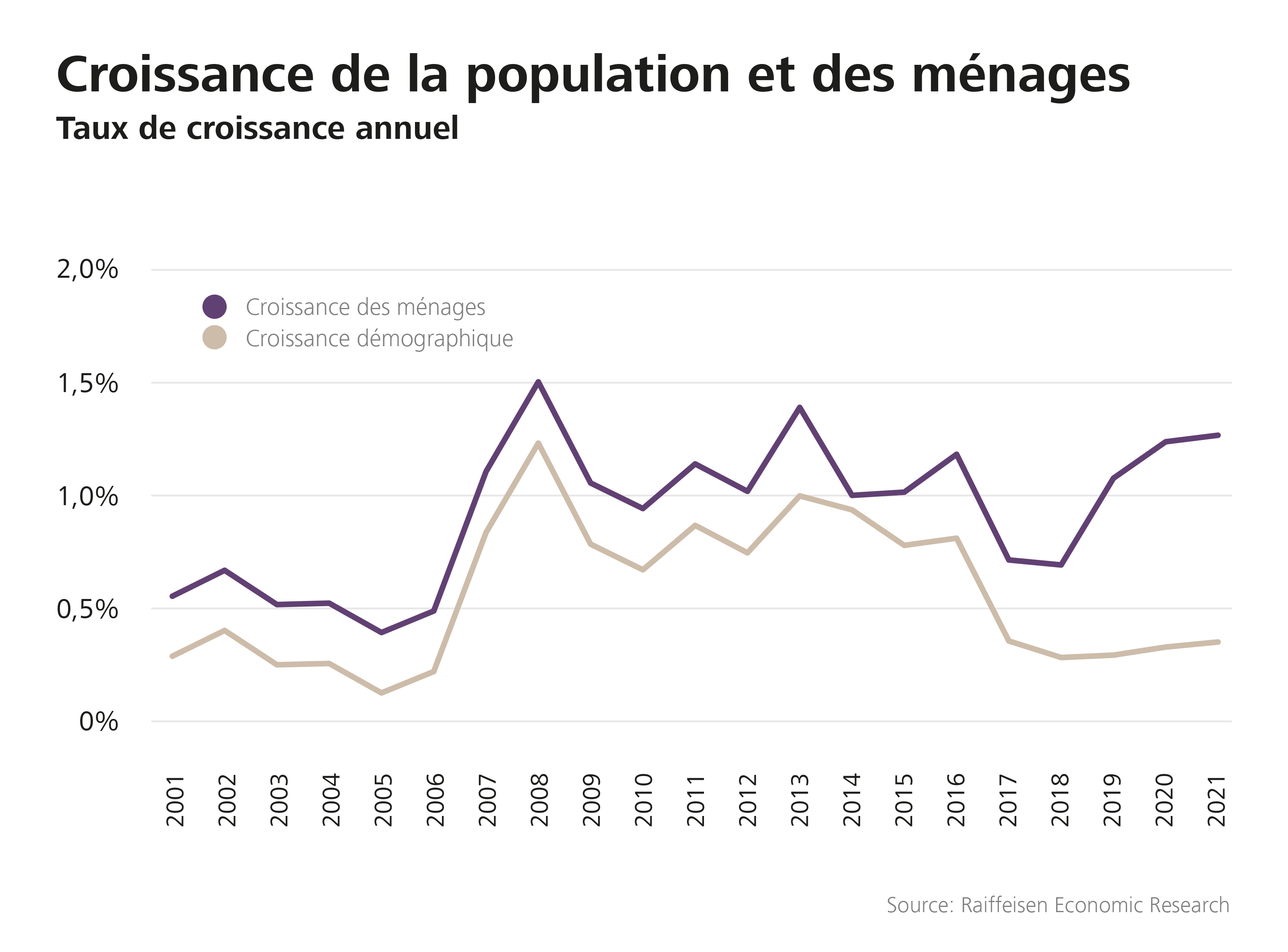 En raison de ces deux mégatendances, les gens vivront à l'avenir dans des logements de plus en plus petits, et le nombre de ménages augmentera plus vite que la population. L'an dernier, le nombre de nouveaux foyers a dépassé celui des nouveaux logements construits pour la première fois depuis 2009, avec pour conséquence logique une baisse des objets vacants. Et ce n'est que le début. Partant de l'hypothèse d'une immigration constante, Raiffeisen table sur 51'000 demandes de logement supplémentaires cette année et sur une demande légèrement inférieure, mais toujours très forte, en 2023 avec un peu plus de 48'000 demandes. «La construction de nouveaux logements ne pourra pas suivre la demande à l'avenir. L'offre excédentaire qui prévalait sur le marché jusqu'à récemment pourrait tourner à la pénurie d'ici peu», constate Martin Neff. Aujourd'hui déjà, les loyers proposés repartent à la hausse après des années de baisse. L'écart entre loyers actuels et nouveaux loyers risque de se creuser encore davantage.
