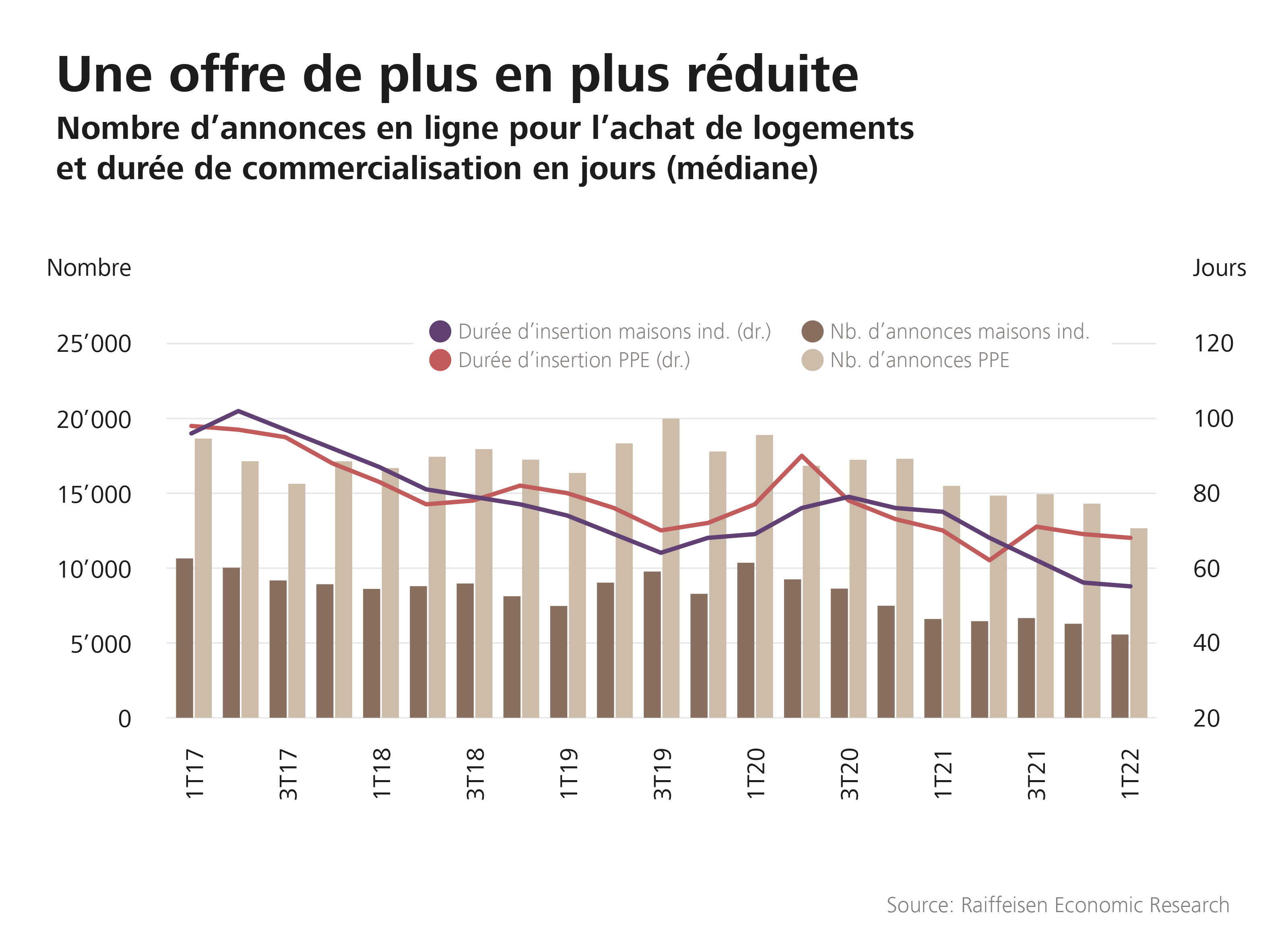 Il existe encore des solutions de financement grâce auxquelles l'achat reste nettement plus avantageux que la location. Par ailleurs, différents arguments autres que financiers expliquent que la population suisse soit toujours demandeuse en propriété du logement, même avec des taux d'intérêt élevés. «Une demande toujours aussi forte se heurte désormais à une offre totalement asséchée. Il ne se construit que très peu de nouveaux biens, et les propriétaires ne vendent leurs maisons ou appartements que dans des cas exceptionnels. Les prix continueront de monter, même si la demande fléchit un peu à moyen terme. La dynamique de hausse des prix ne devrait ralentir que progressivement, tout au plus», explique Martin Neff, chef économiste de Raiffeisen Suisse.
