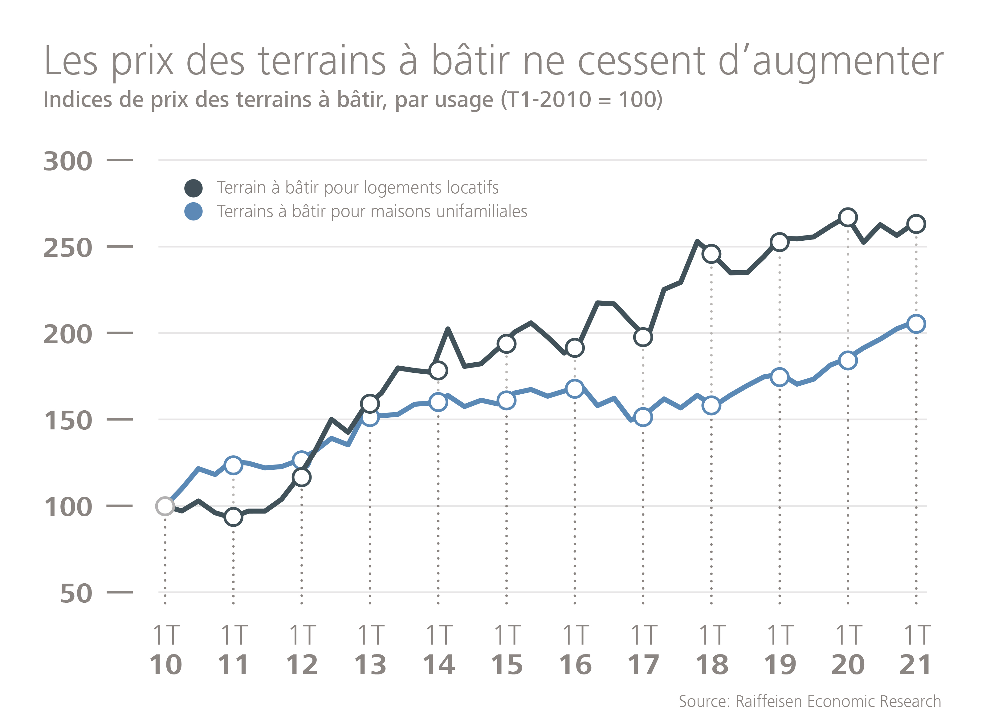 Dans la publication actuelle «Immobilier Suisse», les économistes de Raiffeisen ont accordé une attention particulière au marché peu exploré des terrains à bâtir. Les terrains à bâtir non bâtis, en particulier à usage résidentiel, se raréfient en Suisse. Et c'est justement là que le besoin est le plus urgent. Les exigences réglementaires strictes en matière de gestion des ressources foncières limitées continueront à maintenir l'offre à un faible niveau, également à l'avenir. Dans le même temps, dans le contexte de taux bas actuel, les parcelles vacantes pour les logements à usage propre et les appartements à louer sont très demandées, ce qui a conduit à d'importantes hausses de prix ces dernières années. Ce n'est que dans les communes touristiques que les grandes réserves de terrains à bâtir et les restrictions claires du cercle d'acheteurs par la loi sur les résidences secondaires ont entraîné une baisse des prix. Alors que les prix des terrains ont augmenté de manière significative dans la plupart des régions, les prix de la construction n'ont connu qu'une très légère hausse. «Ce ne sont pas les maisons qui renchérissent en Suisse, mais seulement les terrains sur lesquels elles se trouvent», constate Martin Neff.