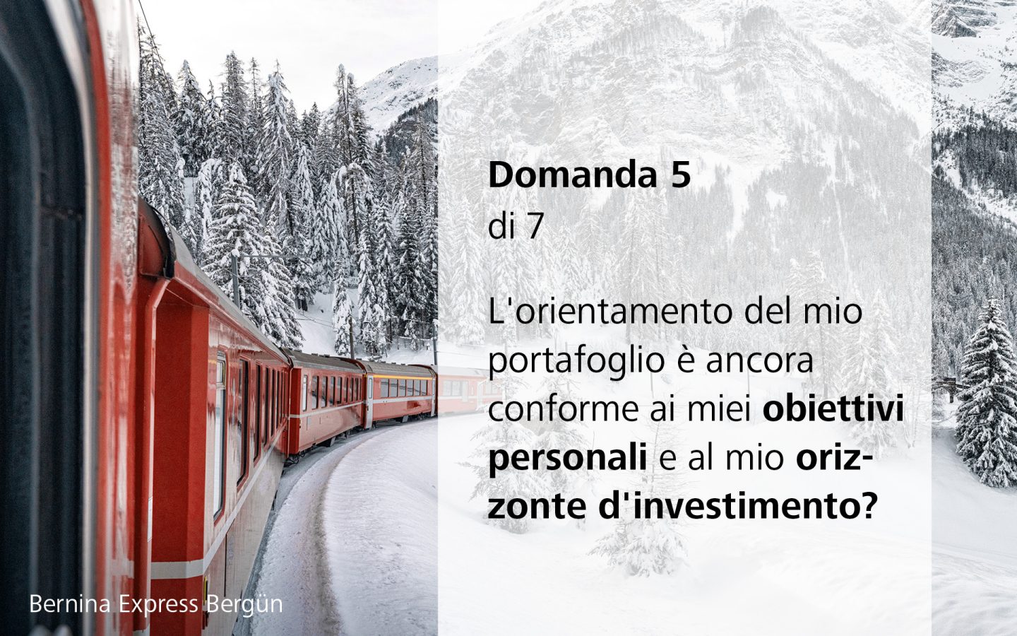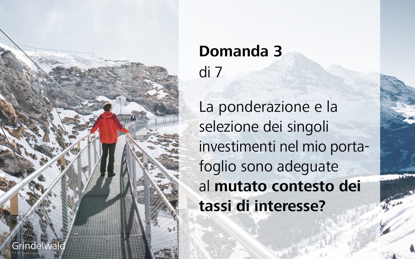Il vostro patrimonio è strutturato in modo ottimale per affrontare al meglio l'anno 2024? Iniziate il nuovo anno di investimento ben preparati con il check individuale del patrimonio. Grazie a un check del patrimonio personale, vi mostriamo con chiarezza l'andamento dei vostri investimenti ed effettuiamo insieme a voi una valutazione accurata del vostro portafoglio e della strategia d'investimento.