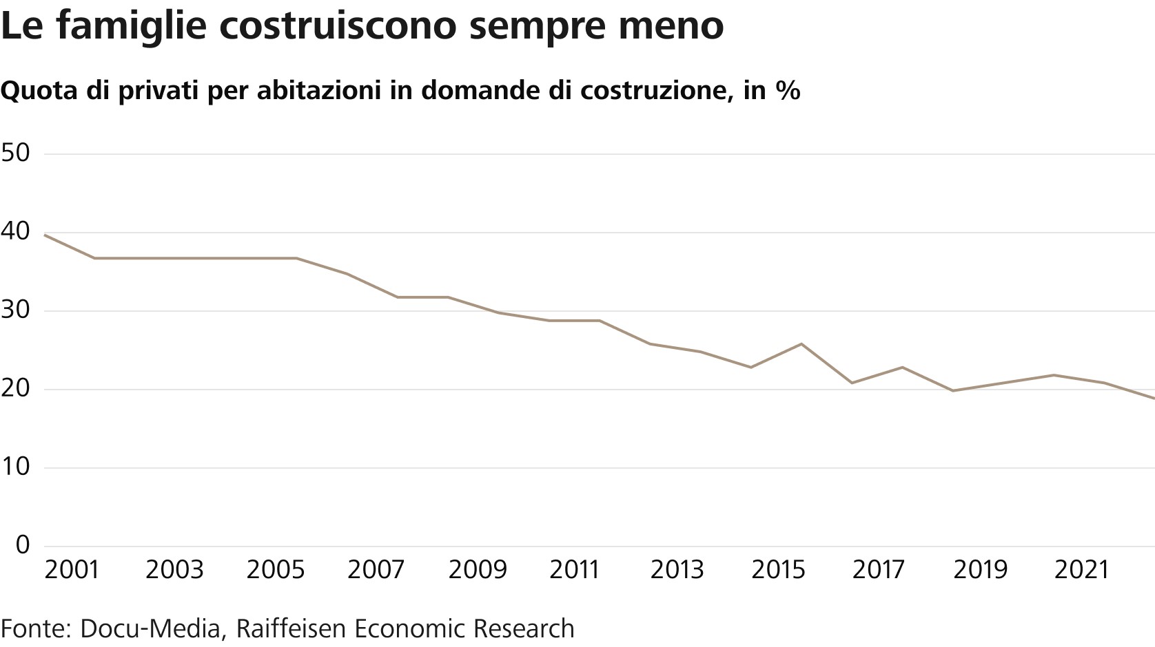 San Gallo, 16 maggio 2024. I privati si stanno ritirando sempre più dall'edilizia residenziale. Oltre al principio dell'edilizia ad alta densità, che aumenta ulteriormente la complessità dei progetti edilizi, sono responsabili di questo sviluppo anche la marea di normative, la tendenza a costruire edifici residenziali più grandi e persino alcuni «fenomeni legati alla prosperità», come il declino delle competenze artigiane. Circa un appartamento nuovo su dieci, tra quelli da affittare, viene costruito da committenti privati. Vent'anni fa era ancora uno su cinque. Sempre più spesso i privati lasciano ai professionisti anche la costruzione di case unifamiliari. Nel 2008 due terzi delle domande di costruzione di case unifamiliari erano presentate da privati, mentre ora questo dato è pari a meno della metà. Come osserva Raiffeisen Economic Research nello studio, la crescente complessità sembra scoraggiare molti committenti privati. Per contro, gli investitori istituzionali dispongono generalmente di maggiori risorse finanziarie e umane e possono conseguire economie di scala e sinergie. Si osserva, inoltre, che i privati non solo agiscono meno in qualità di committenti della costruzione, ma vendono anche più frequentemente i loro immobili a reddito, in particolare a investitori istituzionali. Di conseguenza, dal 2017, la percentuale di abitazioni in locazione di proprietà privata è scesa dal 49 al 45 per cento. «Per molto tempo quest'evoluzione non è stata avvertita, perché durante il periodo di bassi tassi d'interesse gli investitori istituzionali hanno volentieri colmato il vuoto lasciato dai privati. È stato solo con l'aumento dei tassi d'interesse e la diminuzione della relativa attrattiva degli investimenti immobiliari che gli investitori istituzionali hanno moderato i loro appetiti, facendo così venire alla luce il ritiro dei committenti privati in corso da molti anni», spiega Fredy Hasenmaile, Economista capo di Raiffeisen Svizzera. Allo stesso tempo è probabile che anche alcuni fenomeni legati alla prosperità abbiano rafforzato la tendenza. «Le competenze artigiane di base dei cittadini svizzeri tendono a diminuire, poiché ci sono sempre più lavori d'ufficio e la maggior parte dei lavoratori dipendenti non svolge quasi alcuna attività artigiana nel proprio lavoro quotidiano. Inoltre, nella nostra «società del tempo libero» le persone preferiscono sempre di più un weekend libero dopo una dura settimana di lavoro a un «secondo lavoro» in cantiere», aggiunge Hasenmaile.