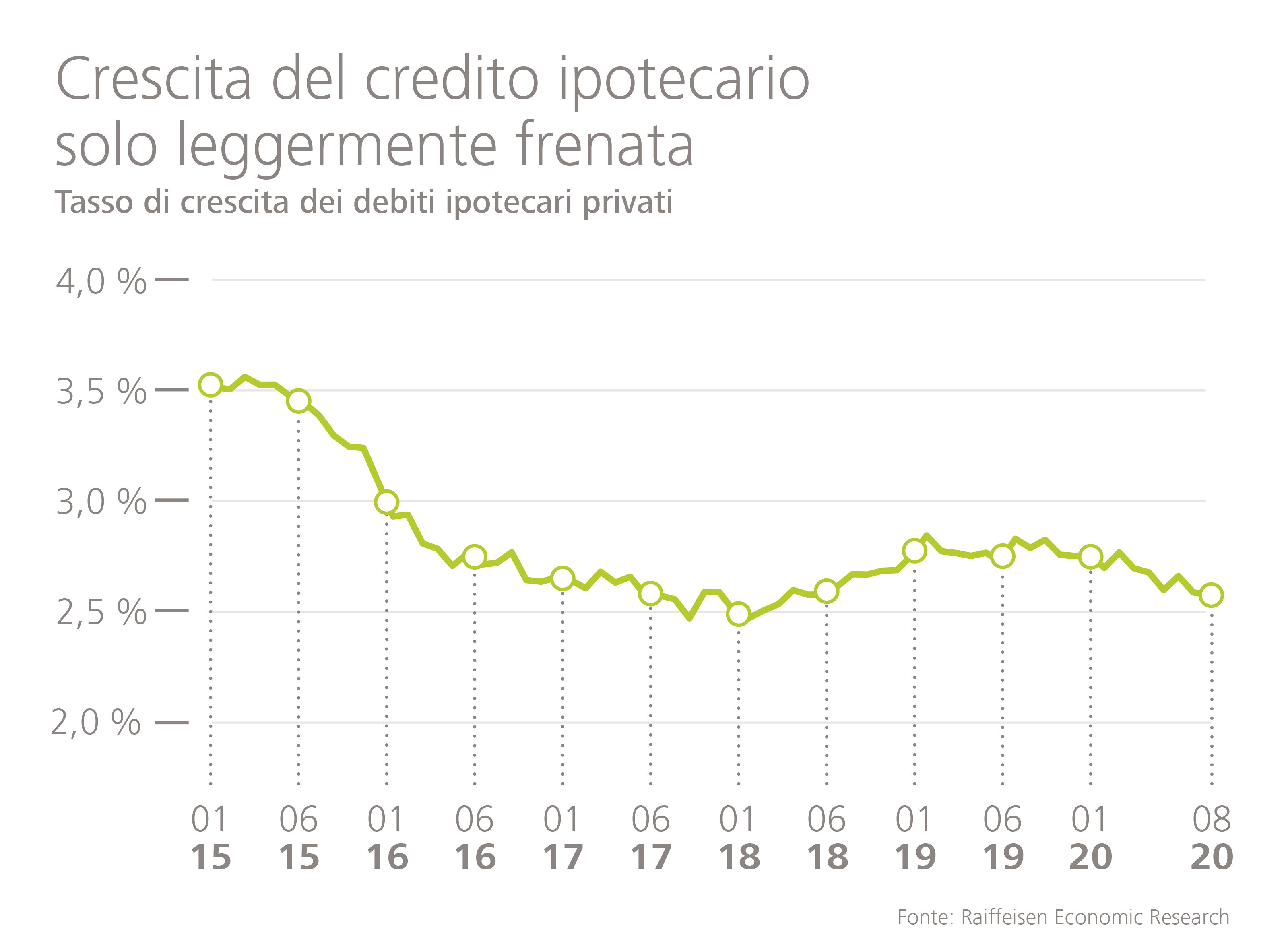 La crescita del volume di crediti ipotecari da inizio anno è rallentata, ma con circa il 2.5 per cento (anno precedente: 3.2 %) si attesta ancora a un ottimo livello. Sulla concessione di ipoteche, i creditori hanno tirato il freno solo di poco. Le case unifamiliari e gli appartamenti in proprietà vengono ancora richiesti, acquistati e anche finanziati. Ciò dimostra un'immutata fiducia di tutti gli operatori di mercato, nonostante la pandemia da COVID-19.