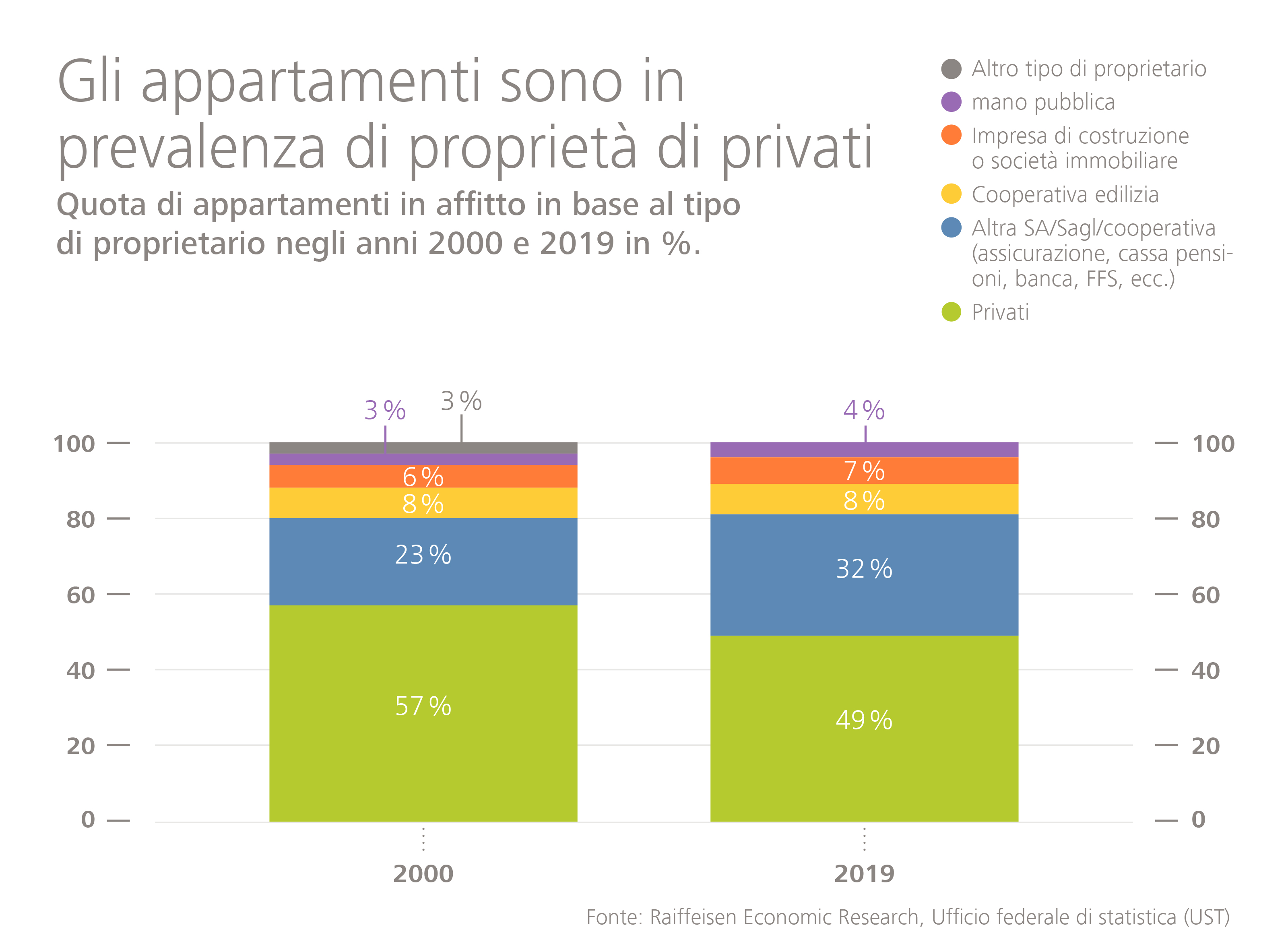 Se si guarda solo al mercato degli appartamenti in affitto, quasi uno su due in Svizzera appartiene a famiglie private (49 %), seguite da investitori istituzionali (33 %), cooperative (8 %) e classiche società immobiliari (7 %). Confederazione, cantoni e comuni possiedono, con il quattro per cento, un numero relativamente basso di appartamenti in locazione in Svizzera. «Queste cifre dimostrano chiaramente quanto sia sbagliato affermare che sul mercato immobiliare svizzero dominino gli investitori professionali», afferma Martin Neff, economista capo di Raiffeisen Svizzera. Nelle zone rurali la rappresentanza dei proprietari privati di appartamenti in locazione è particolarmente nutrita. I proprietari istituzionali si concentrano invece nelle aree più urbane.