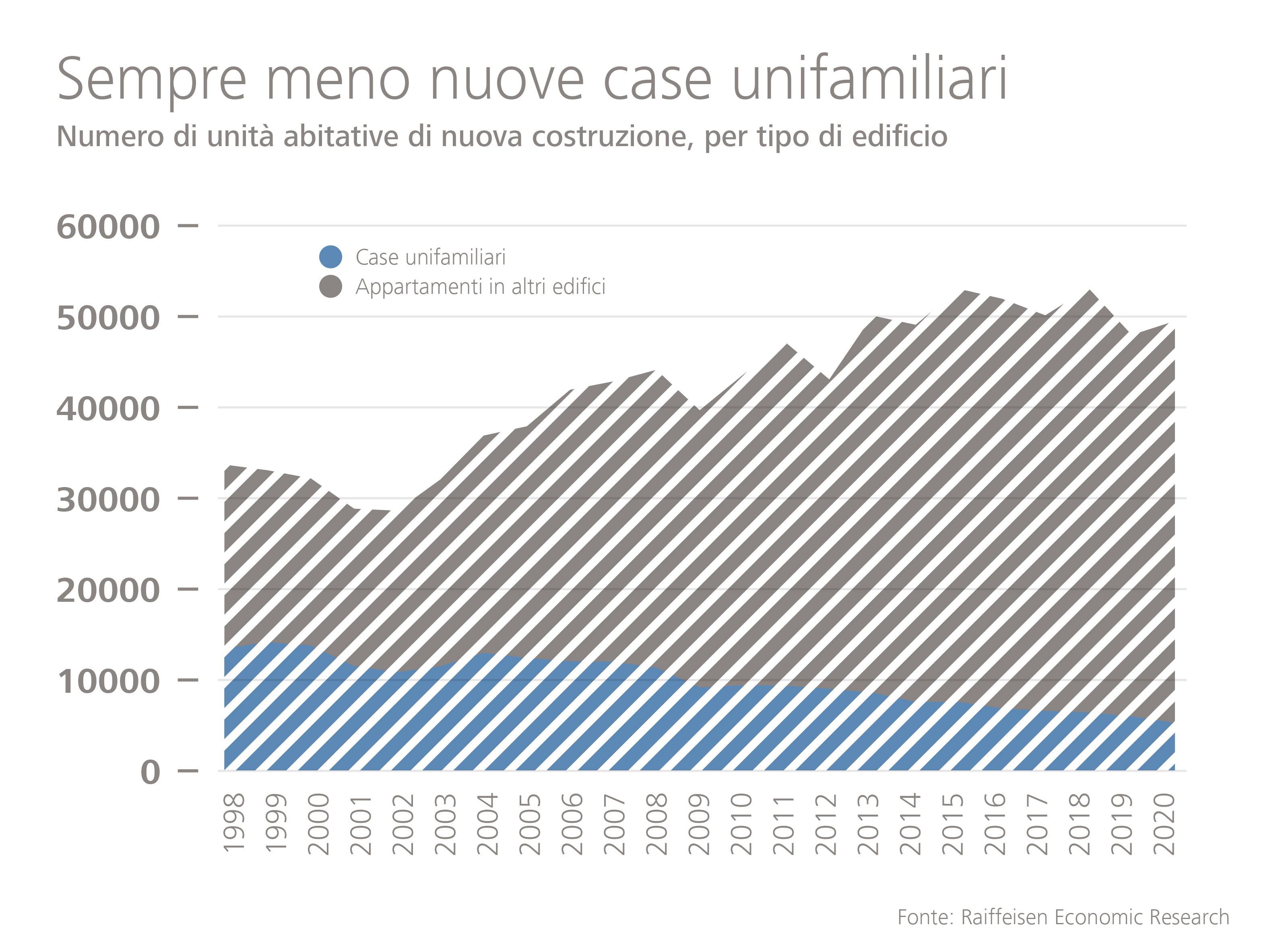 In seguito alle rigide prescrizioni di pianificazione urbanistica, i terreni edificabili in Svizzera sono un bene estremamente raro e ambito. Anche se si costruiscono ancora molti nuovi appartamenti su spazi verdi, la tendenza nel settore edilizio va chiaramente in direzione dell'alta densità. Nel 2000 le case unifamiliari costituivano il 43 per cento delle nuove unità abitative per poi scendere a uno scarso 11 per cento venti anni dopo. Si costruiscono, infatti, sempre più appartamenti «salvaspazio», in case plurifamiliari sempre più grandi e a più piani.
