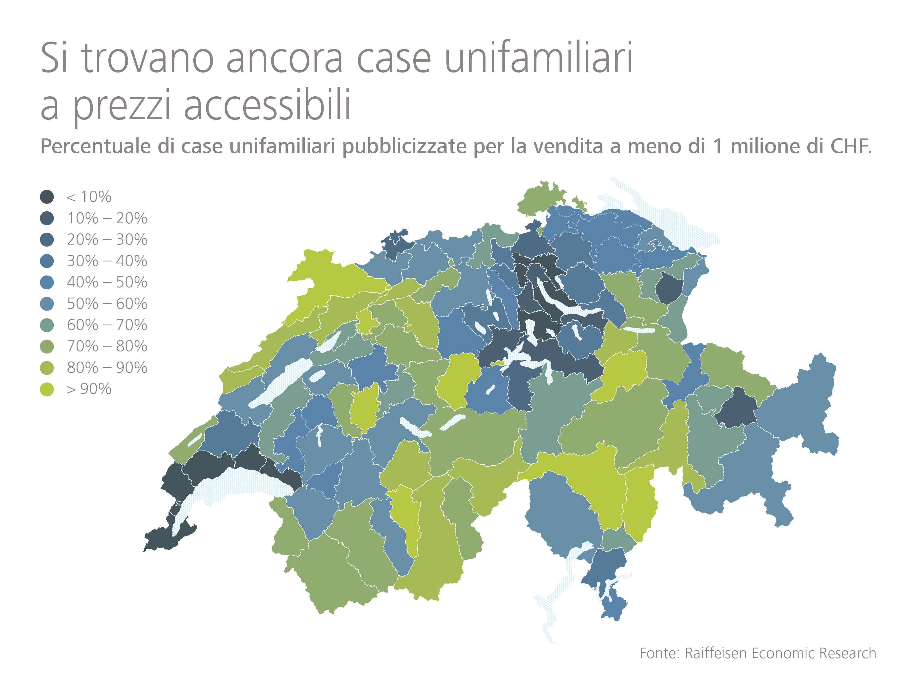Gli immobili a prezzi accessibili non sono però ancora merce rara in Svizzera. Il 30 per cento delle case unifamiliari in vendita sui portali online a fine settembre 2021 costava, infatti, meno di 750'000 franchi e il 13 per cento non arrivava nemmeno a 500'000 franchi. «Nonostante i prezzi alle stelle, in Svizzera non mancano case unifamiliari a prezzi accessibili, fatta eccezione per le posizioni più ambite. Nei comuni con una qualità dell'ubicazione inferiore alla media vi è poca richiesta. È la posizione a generare domanda», afferma Martin Neff, Economista capo di Raiffeisen Svizzera.
