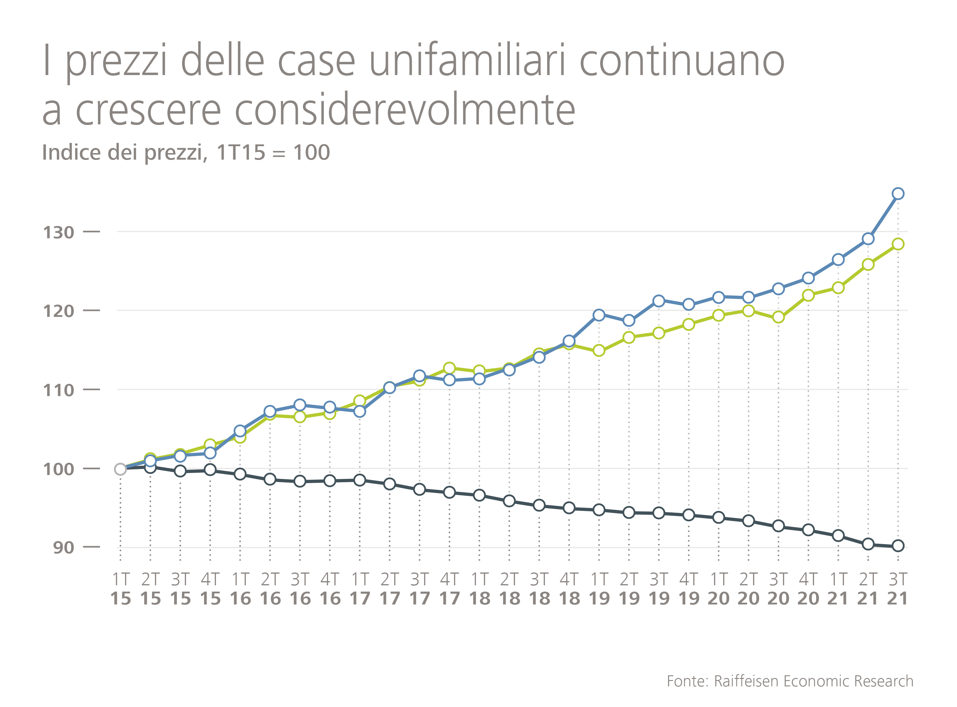 San Gallo, 10 novembre 2021. Nel terzo trimestre del 2021 i prezzi della proprietà di abitazione a uso proprio hanno raggiunto nuovi livelli da record. Se i prezzi della proprietà per piani sono saliti del 2 per cento rispetto all'anno precedente, con il 4,4 per cento le case unifamiliari hanno registrato l'aumento più elevato dal lancio dell'indice Raiffeisen dei prezzi delle transazioni.