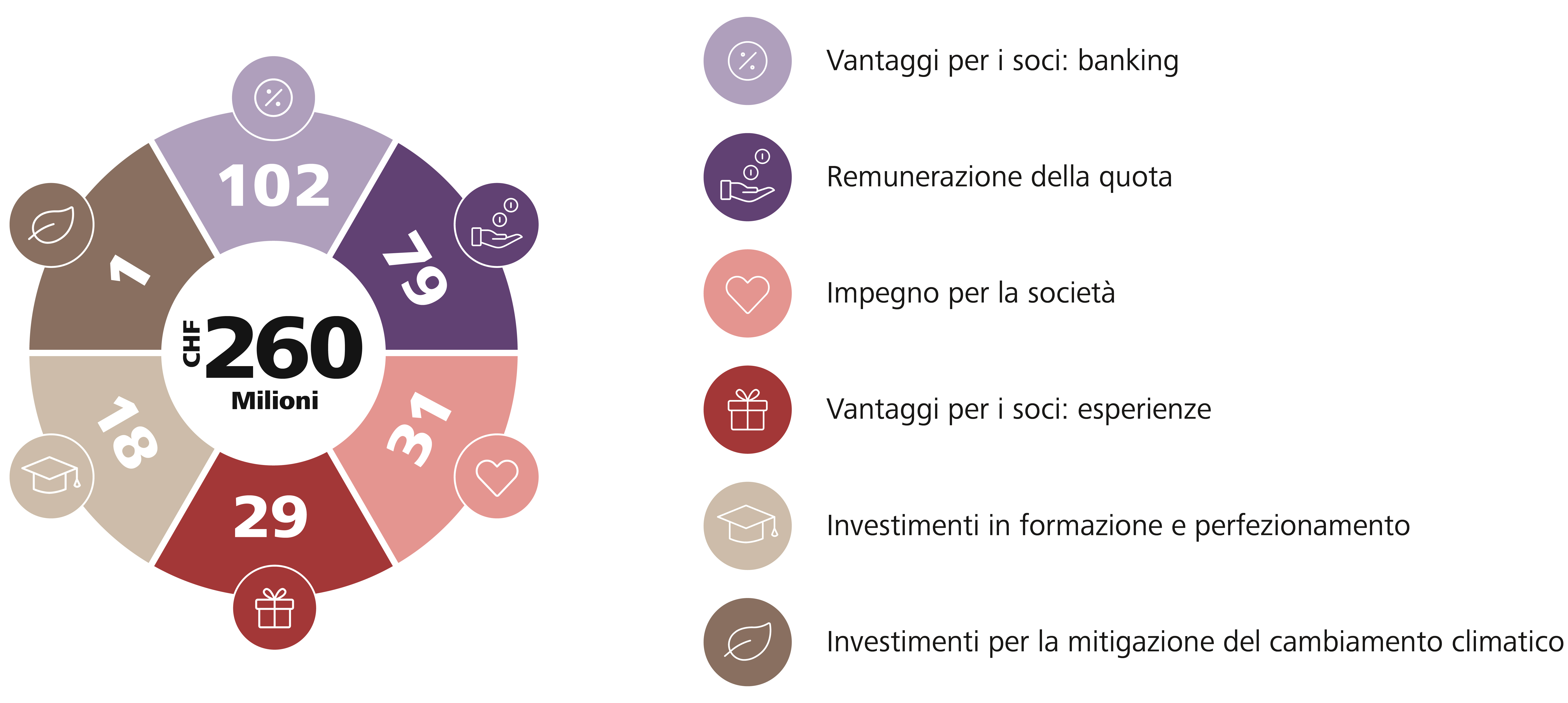 Il modello cooperativo e la vicinanza alla clientela sono tratti distintivi inconfondibili del Gruppo Raiffeisen. Il valore aggiunto che il Gruppo bancario genera per i soci e per la popolazione svizzera viene misurato da Raiffeisen attraverso il Barometro del plusvalore. Nel 2022 le Banche Raiffeisen e Raiffeisen Svizzera hanno generato per soci e collettività un plusvalore di 260 milioni di franchi. Nel 2022 i soci hanno potuto beneficiare di 210 milioni di franchi sotto forma di prodotti bancari agevolati, remunerazioni di quote e vantaggi specifici per i soci. Raiffeisen ha elargito 31 milioni di franchi sotto forma di donazioni e sponsorizzazioni, inclusi i contributi finanziari della Fondazione del centenario Raiffeisen. Il Gruppo, inoltre, ha investito 18 milioni di franchi nella formazione e nel perfezionamento dei propri collaboratori, che sono oltre 11'000. Oltre alle misure per il rafforzamento della sostenibilità nei singoli campi di attività della Banca cooperativa, Raiffeisen ha effettuato investimenti mirati a contrastare il cambiamento climatico. Complessivamente Raiffeisen ha versato un milione di franchi alla Fondazione Svizzera per il Clima, al fondo climatico interno per le misure di efficienza energetica e la compensazione delle rimanenti emissioni di CO₂.