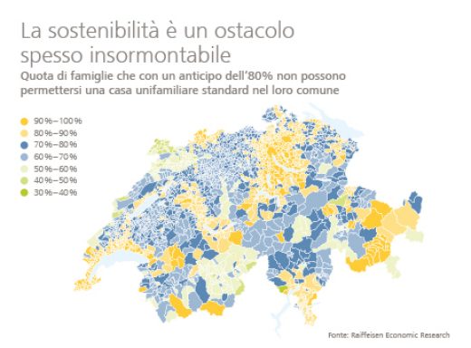 San Gallo, 15 agosto 2019. Per molti svizzeri il sogno della proprietà di abitazione diventa sempre più irraggiungibile. Il 71 per cento della popolazione svizzera non ha un patrimonio sufficiente per permettersi una tipica casa unifamiliare. La sostenibilità indicativa rappresenta un ostacolo ancor più arduo; in quasi ogni comune della Svizzera la maggior parte delle famiglie guadagna troppo poco per poter acquistare una casa unifamiliare nei dintorni.