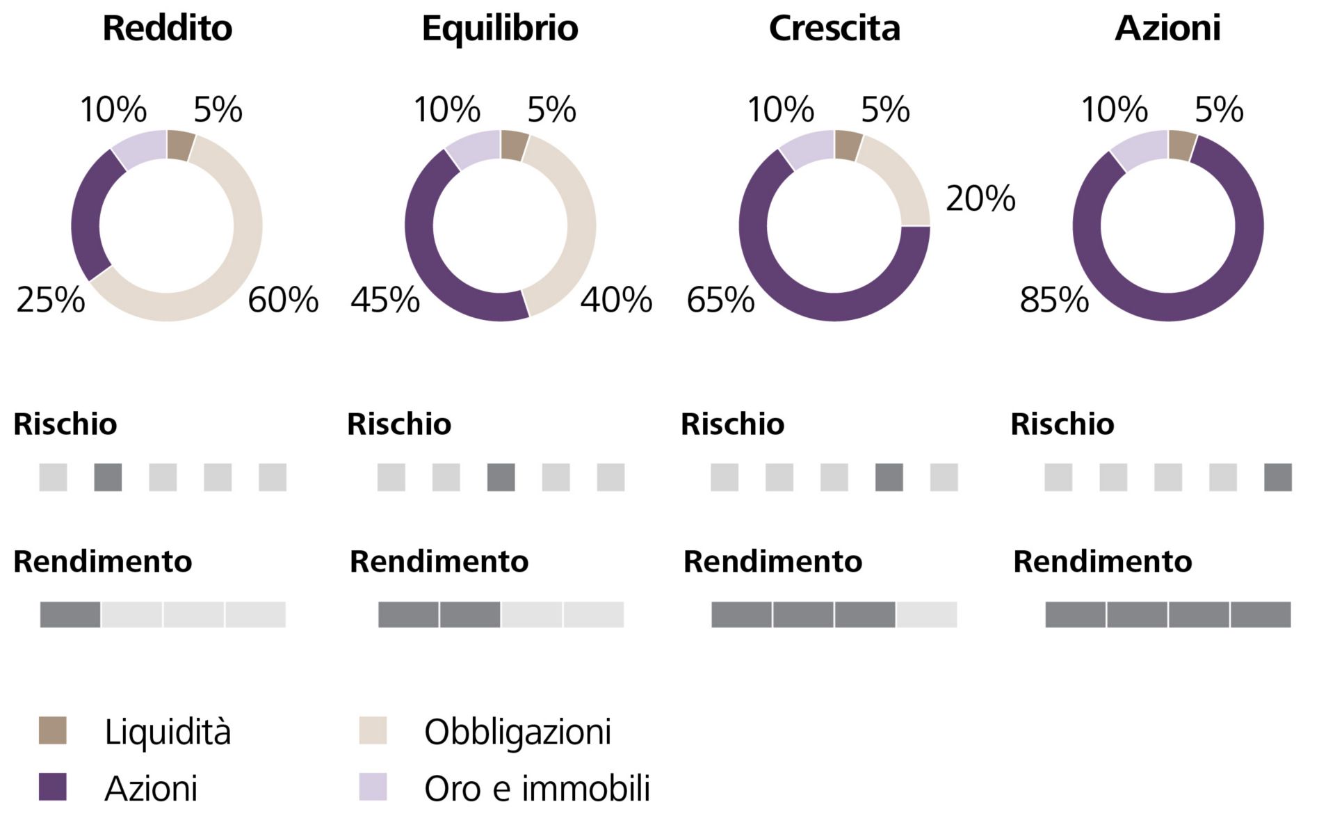 Il vostro portafoglio deve essere in linea con le vostre preferenze e i vostri obiettivi. Ad esempio, potete investire in imprese che desiderate supportare, come aziende attente alla sostenibilità. Allo stesso tempo dovete scegliere un mix che vi offra opportunità di rendimento, ma che sia anche adatto al vostro profilo di rischio. È importante considerare come i diversi investimenti nel vostro portafoglio reagiscono a condizioni di mercato quali oscillazioni dei corsi o movimenti dei tassi, perché solo gli investimenti con correlazione bassa o negativa riducono davvero il rischio nel portafoglio. Se tutti i titoli si comportano allo stesso modo, la diversificazione non protegge. Tuttavia, minimizzando il rischio si riducono anche le opportunità di rendimento. Come regola generale, più investite a lungo termine e più propensi al rischio siete, tante più azioni e titoli esteri potete inserire nel portafoglio: in tal caso si parla di un profilo di rischio più aggressivo.