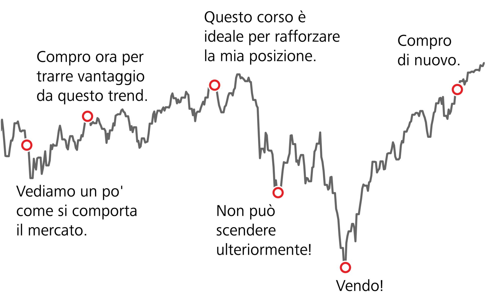 Risultato: se l'investimento si rivela un errore, non solo vi arrabbiate per la perdita, ma anche per non aver considerato adeguatamente i rischi. - Media e blog online parlano da settimane dell'incredibile andamento della borsa. Voi guardate quanto sta accadendo ma temporeggiate. Innanzitutto volete vedere se i corsi crescono in modo costante e sul lungo termine. Poi però pensate che sia giunta l'ora di seguire il trend e investire in azioni.