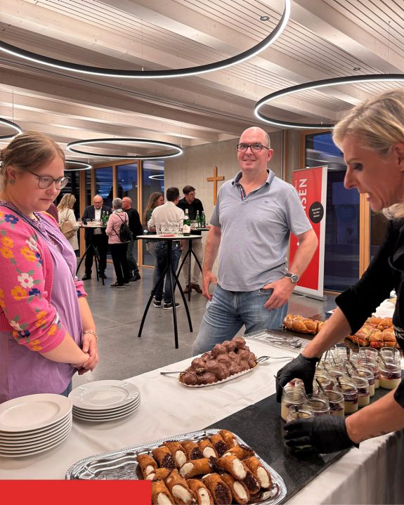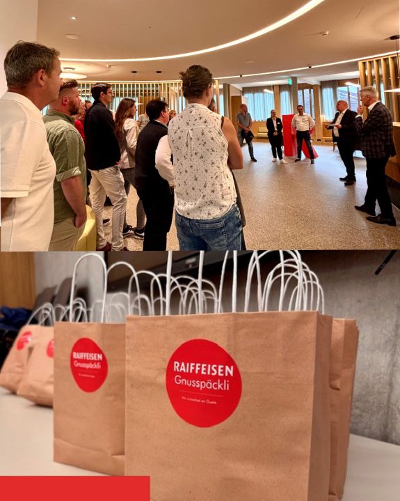 Nach spannenden Informationen von Daniel Wild, Eric Bischofberger und Simon Lumpert wechselten wir die Location in den Pfarreisaal, wo ein feiner Apéro-Riche vom Catering Poesia serviert wurde. Als besonderes Highlight erhielten alle Gäste ein exklusives Raiffeisen-Genusspäckli mit regionalen Spezialitäten: Buureschüblig von der Metzgerei Koller, Käse aus dem Tannzapfenland und Bier von Sohnemann-Bier.