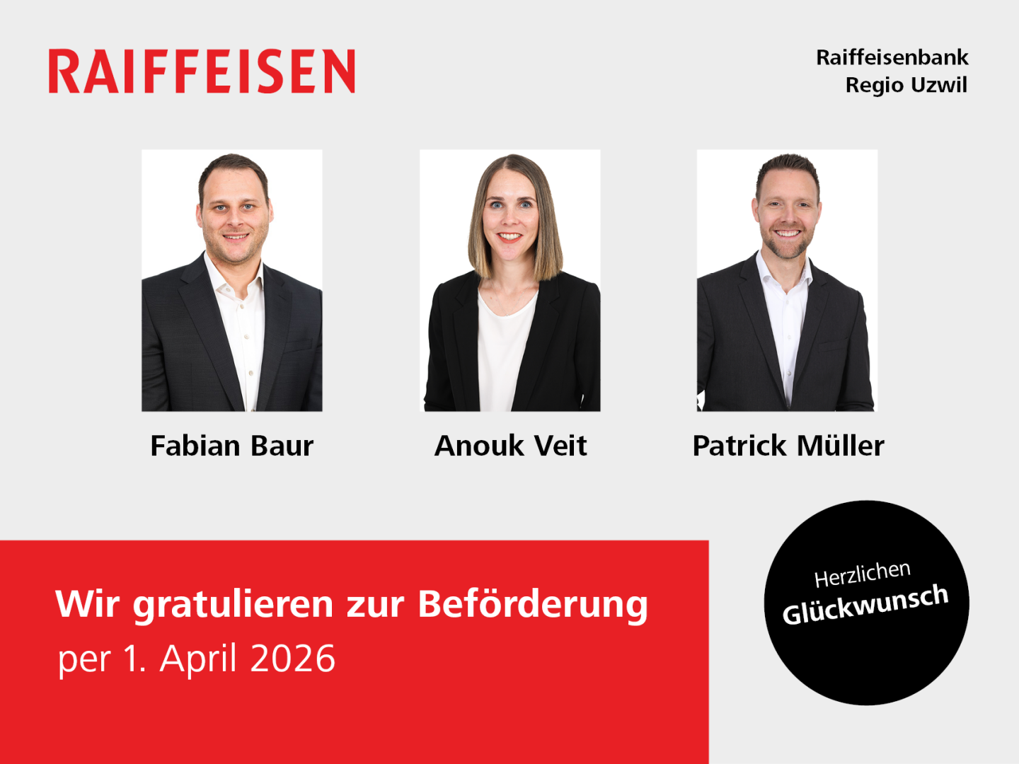 Unser Team darf einen besonderen Moment feiern: Zwei unserer geschätzten Kolleginnen und Kollegen haben mit ausserordentlichem Engagement, grossem Fachwissen und spürbarer Leidenschaft einen wichtigen Meilenstein erreicht. Sie sind neu Mitglieder des Kaders unserer Raiffeisenbank (v.l.):