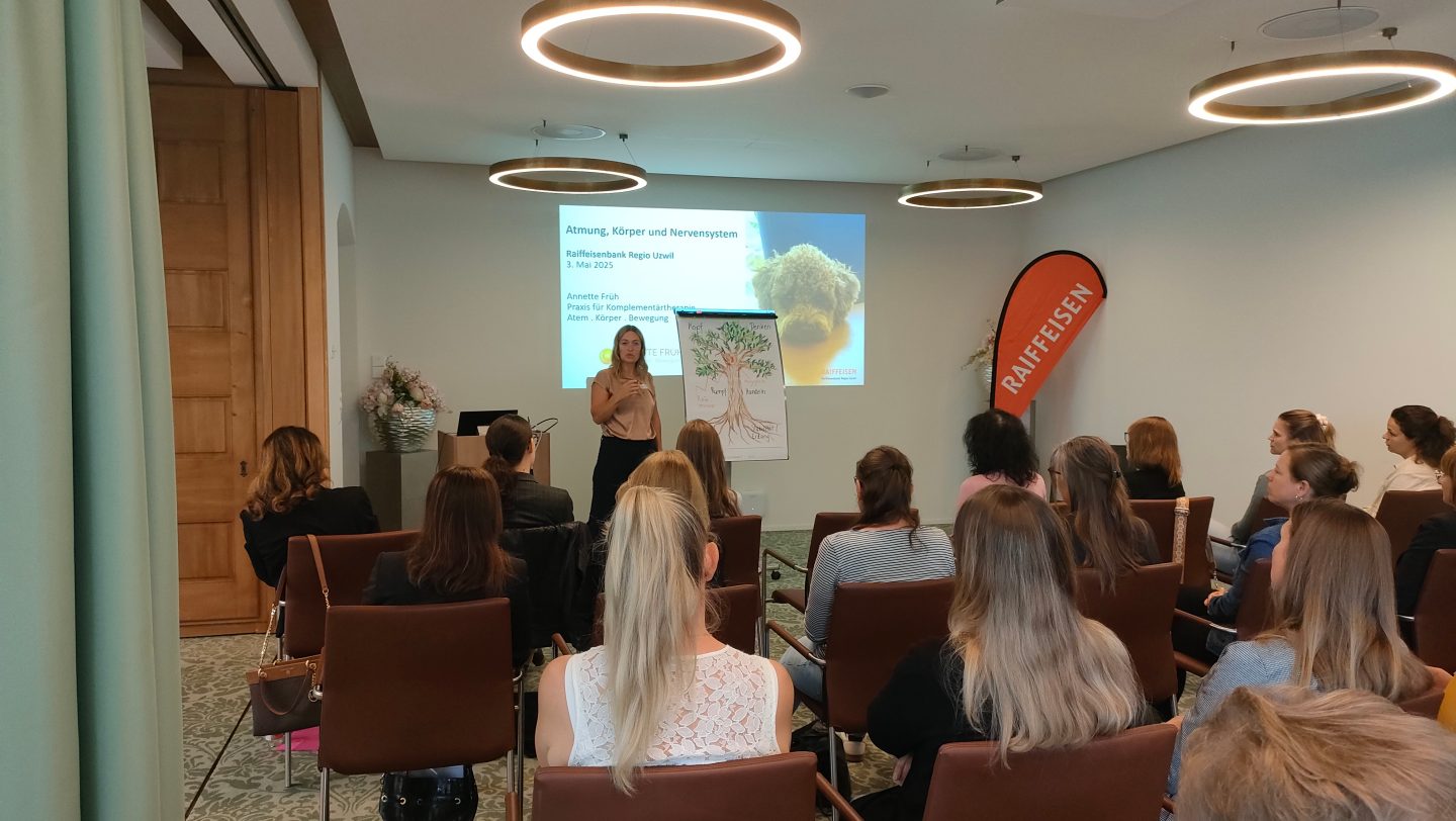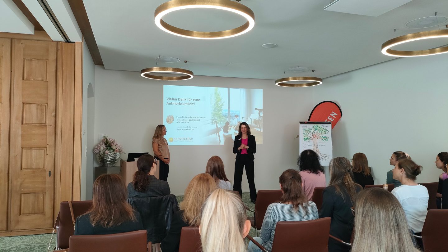 Im Anschluss begeisterte Annette Früh mit ihrem interaktiven Vortrag, bei dem die Teilnehmerinnen aktiv eingebunden wurden. Gemeinsam wurden Übungen durchgeführt, die das Nervensystem aktivierten und für Entspannung sorgten. Verschiedene Atemtechniken wurden ausprobiert, die nicht nur für den Moment wohltuend waren, sondern auch leicht im Alltag angewendet werden können.