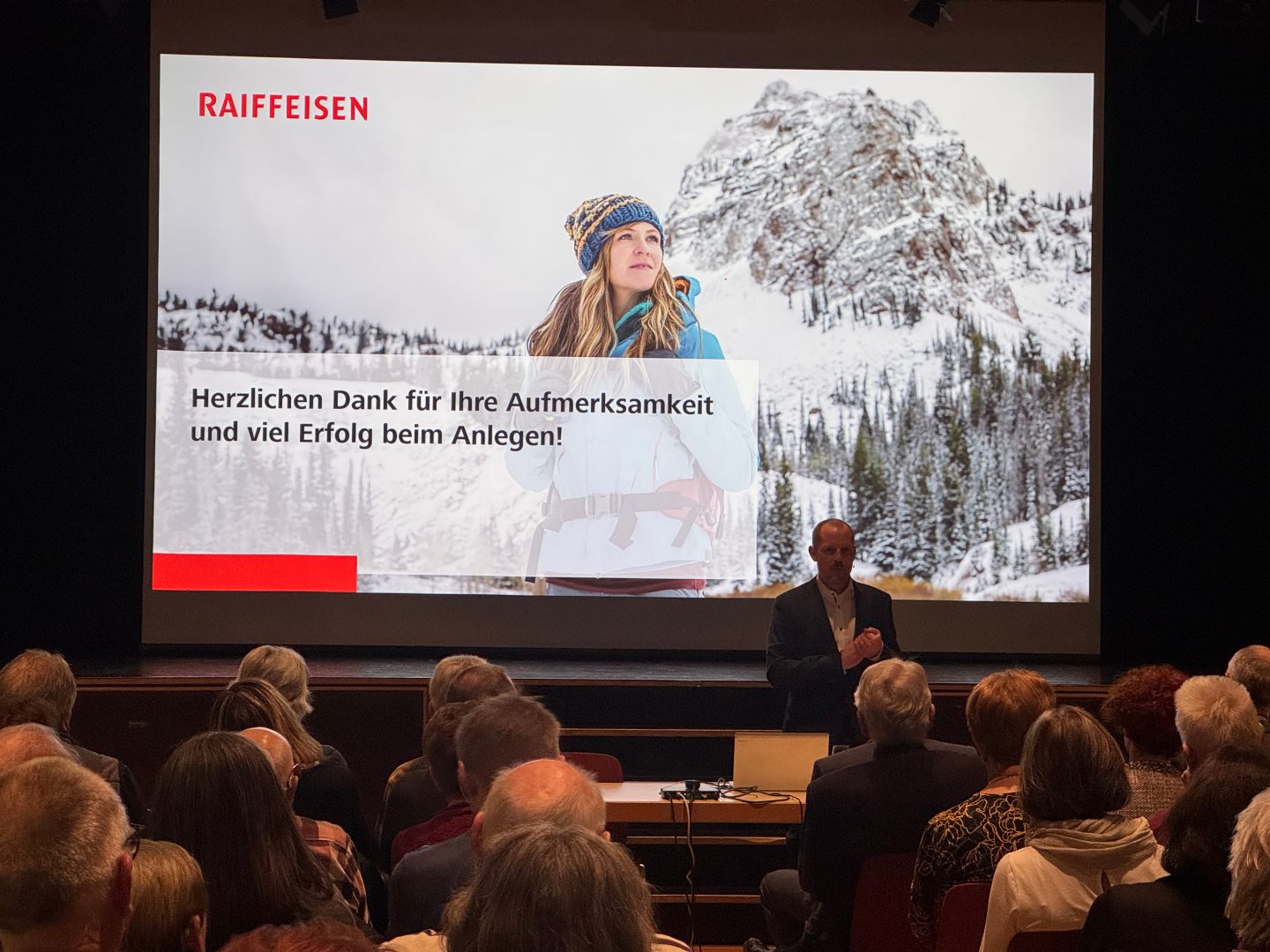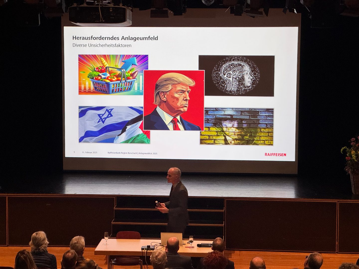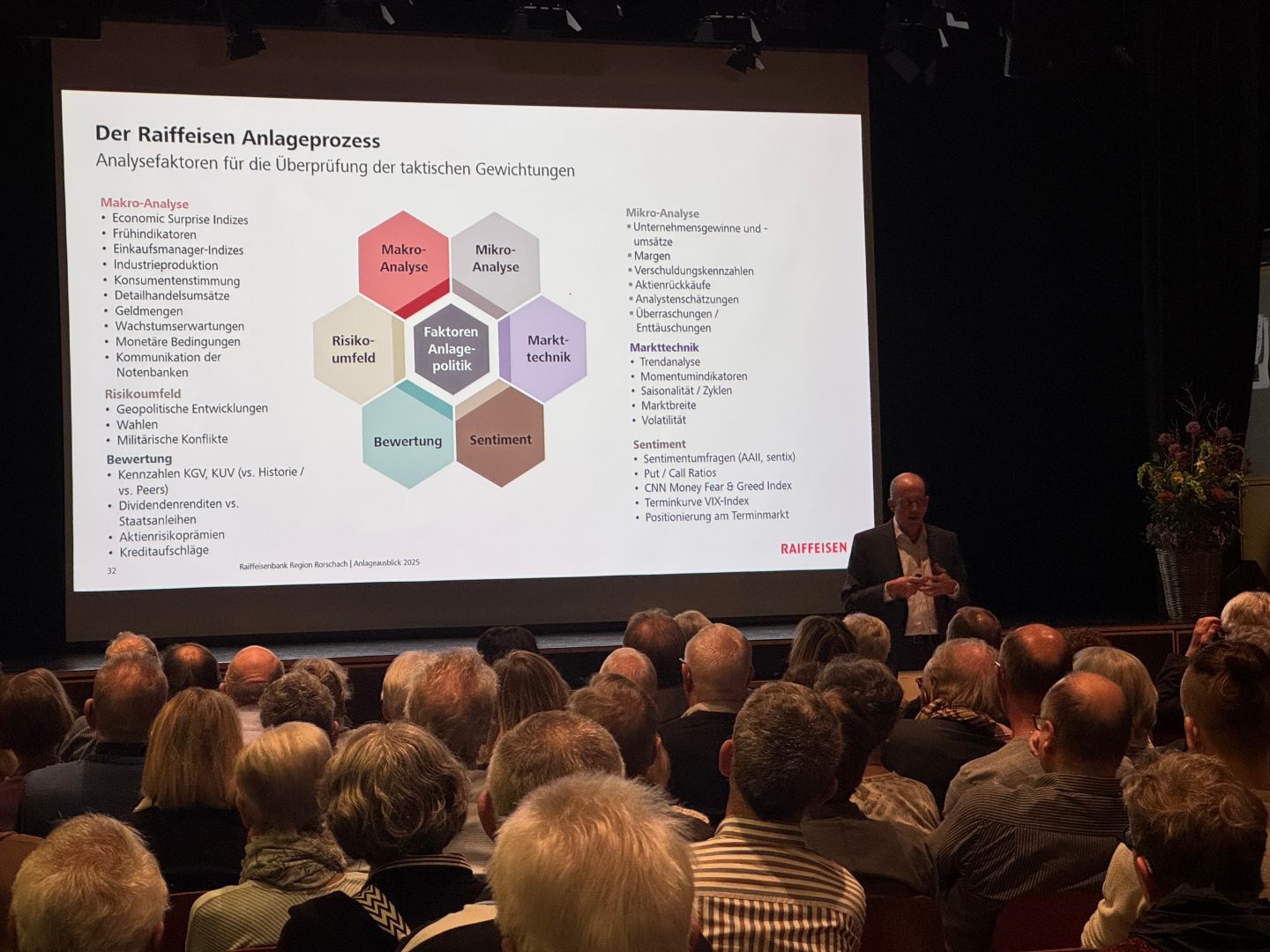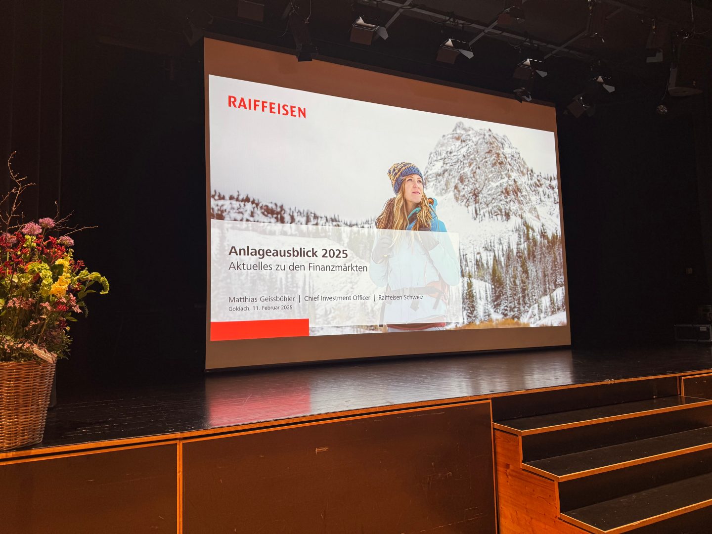 Am Dienstag, den 11. Februar 2025, versammelten sich für den Event «Anlageausblick 2025» rund 140 Gäste in der Aula Goldach. Fabian Fritz, Gastgeber und Leiter der Vermögensberatung der Raiffeisenbank Region Rorschach, hat zusammen mit den Experten Matthias Geissbühler, Chief Investment Officer, und Andreas Forster, Portfolio Manager von Raiffeisen Schweiz, fundierte Einblicke in die Finanzwelt geboten.