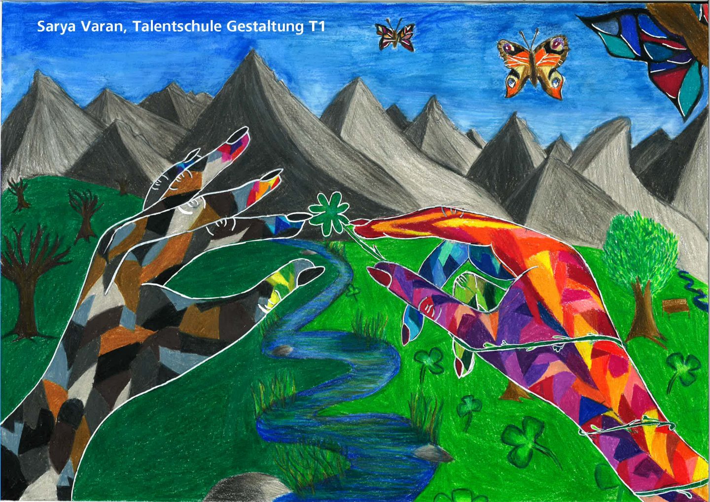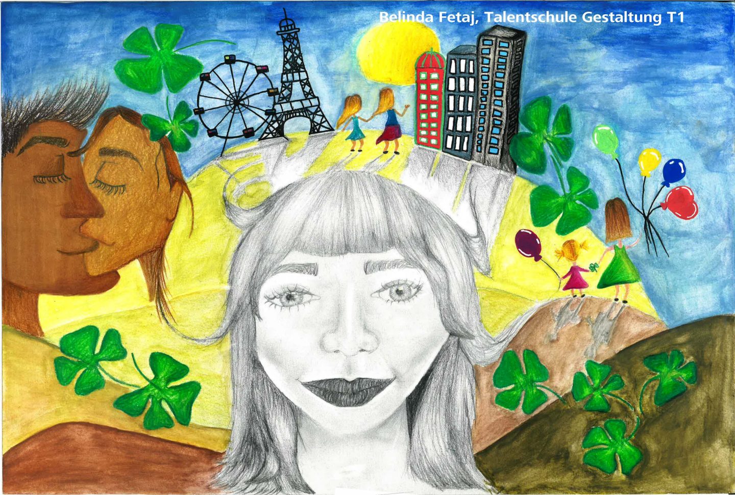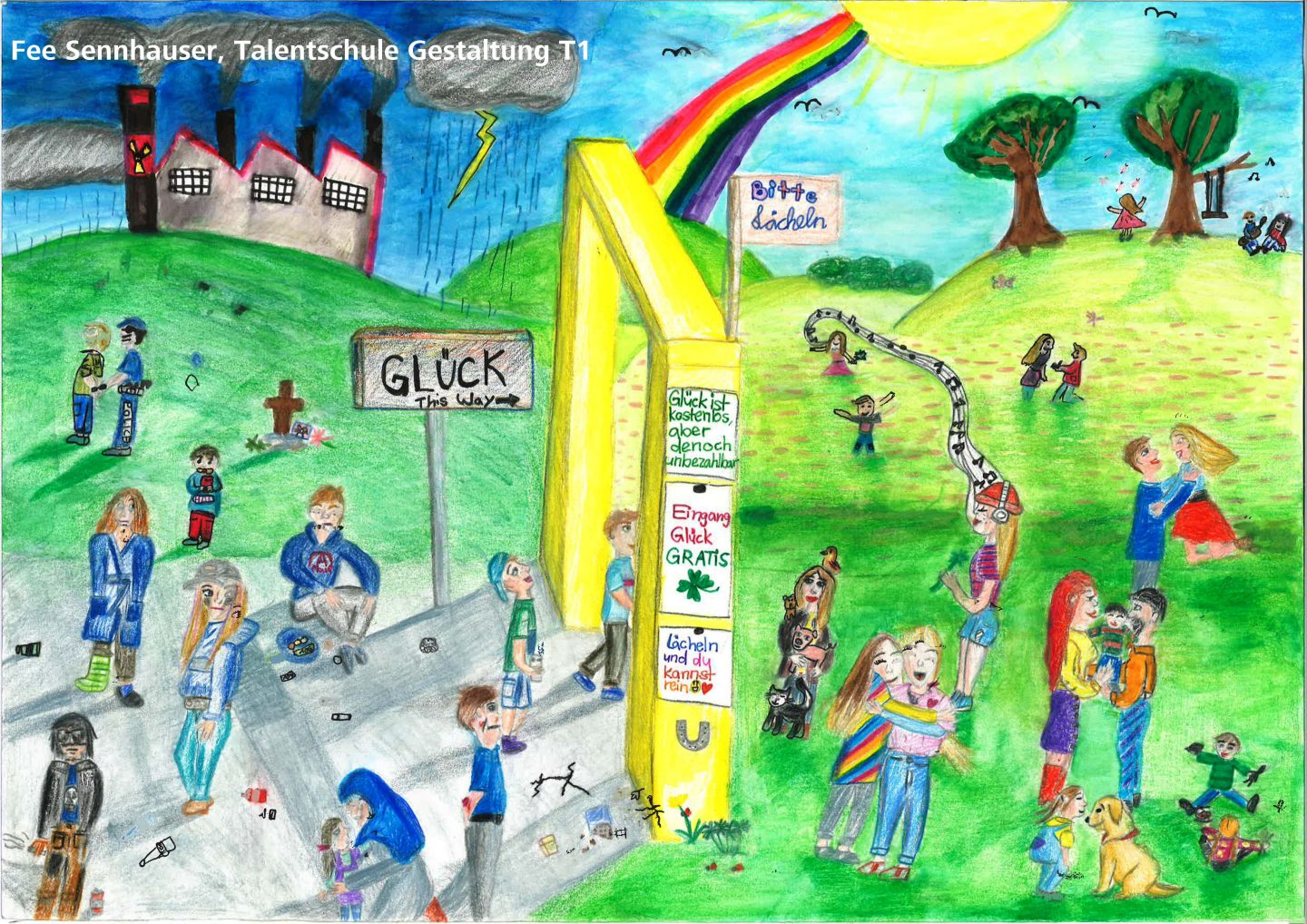 Es gibt viele Dinge, die uns glücklich machen. Das ist gut, denn diese schönen Momente machen uns stark. Sie helfen uns über Zeiten hinweg, in denen wir auch mal traurig und wütend sind. Jeder braucht Glücksmomente, grosse wie kleine. Mal ist es ein Wunsch, der in Erfüllung geht. Mal ein besonderes Erlebnis: im Urlaub am Strand, auf dem Riesenrad oder beim Spielen mit Freunden. Ein anderes Mal ist es die Umarmung von einem lieben Menschen. Das alles kann glücklich machen und hat das kreative Potenzial der jungen Künstlerinnen und Künstler herausgefordert.