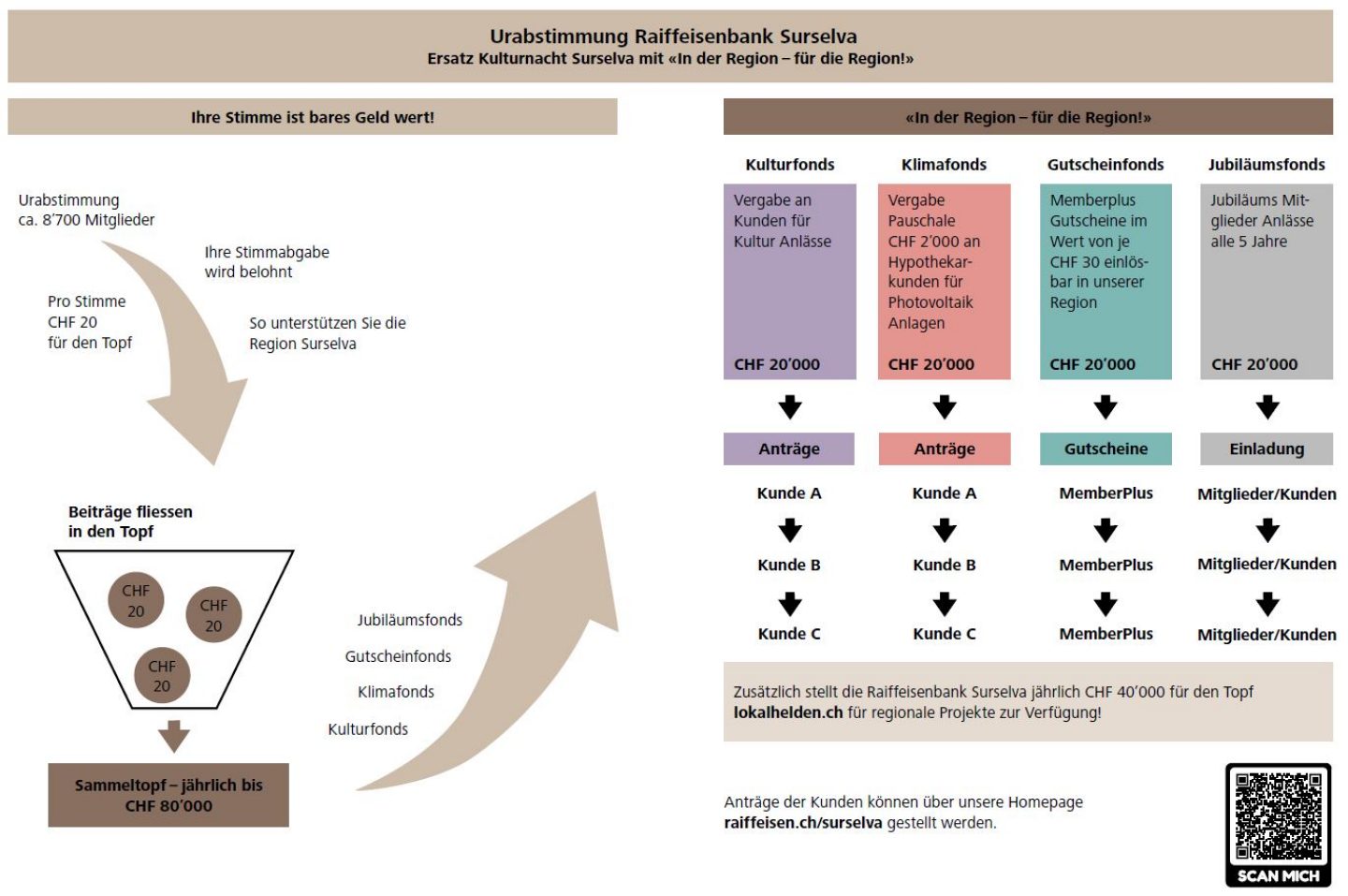 Alle Fonds zusammen können jährlich höchstens mit CHF 80‘000 angehäuft werden. Von diesen Fonds können Projekte in der Region Surselva profitieren. Die Fondsgelder vergeben wir nach dem Prinzip „Es hät solangs hät“!