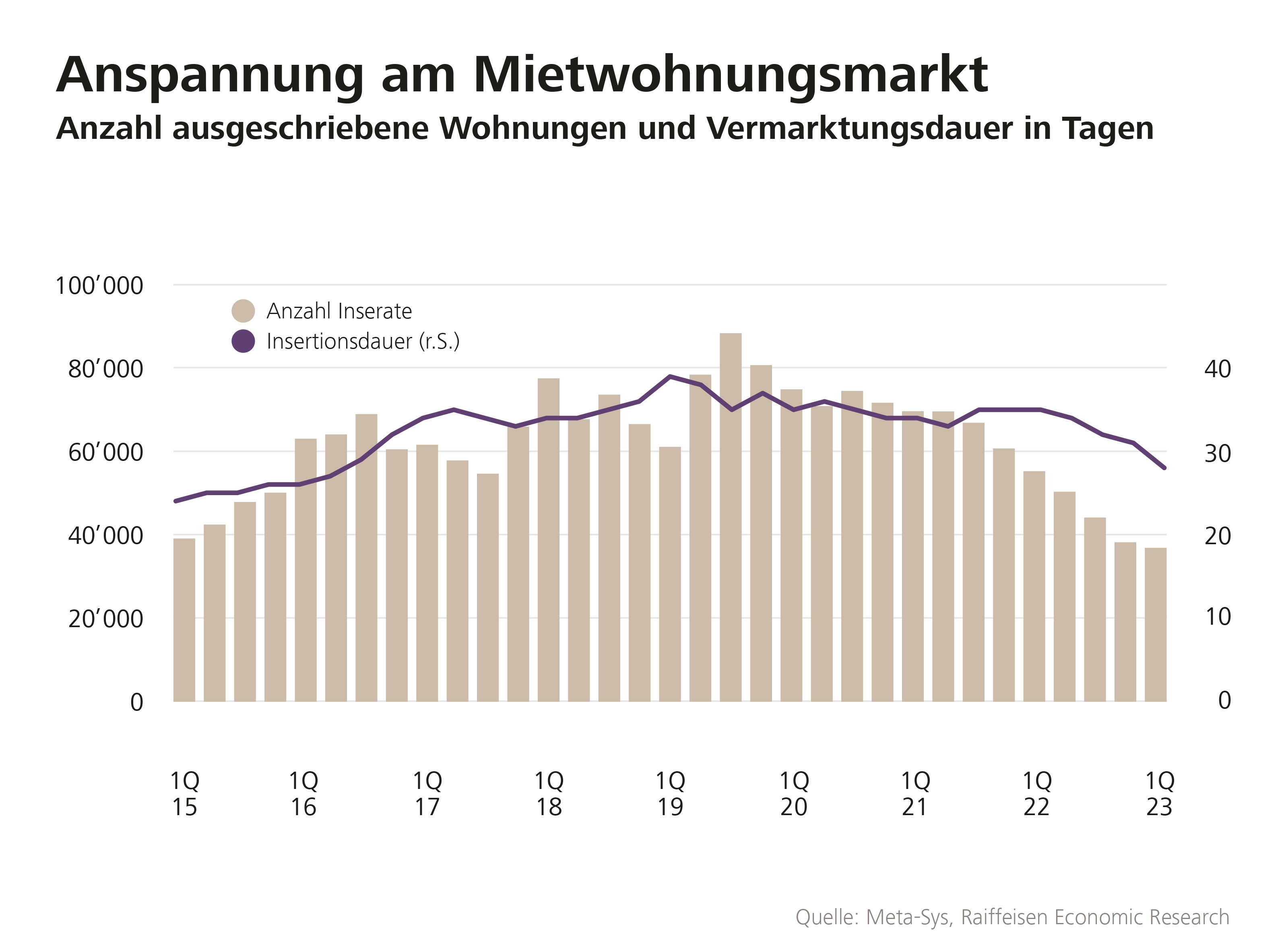 Während sich am Eigenheimmarkt eine Abkühlung ankündet, hat der Wind am Mietwohnungsmarkt in die Gegenrichtung gedreht. Sämtliche Indikatoren zeugen hier von einem deutlichen Anstieg der Markttemperatur. Immer mehr Haushalte sind auf der Suche nach den immer knapper werdenden Mietwohnungen. So hat die Zahl der online ausgeschriebenen Mietwohnungen im Vorjahresvergleich um stattliche 33 Prozent abgenommen. Damit einher geht auch eine deutlich kürzere Vermarktungsdauer. Im ersten Quartal 2023 mussten Mietwohnungen im eidgenössischen Schnitt nur noch 28 Tage ausgeschrieben werden. Das ist rund eine Woche oder 20 Prozent weniger als der Durchschnittswert von 35 Tagen, der sich in den letzten Jahren etabliert hat. Eine Besserung der vielerorts bereits angespannten Marktlage ist nicht in Sicht. Weder von der Angebots- noch von der Nachfrageseite kann in nächster Zeit mit Entspannungsimpulsen gerechnet werden. Eine dynamische Zuwanderung wird die Nachfrage hochhalten. Gleichzeitig planen Investoren trotz sinkender Leerstände und bald deutlich steigender Mieten bisher keine Ausweitung der Wohnbautätigkeit. «Im Umfeld steigender Baupreise, erhöhter Finanzierungskosten, immer höherer administrativer Hürden und deutlich gestiegener Opportunitätskosten reichen die Erhitzungszeichen nicht, um die Attraktivität neuer Bauprojekte genügend zu steigern», erklärt Neff.