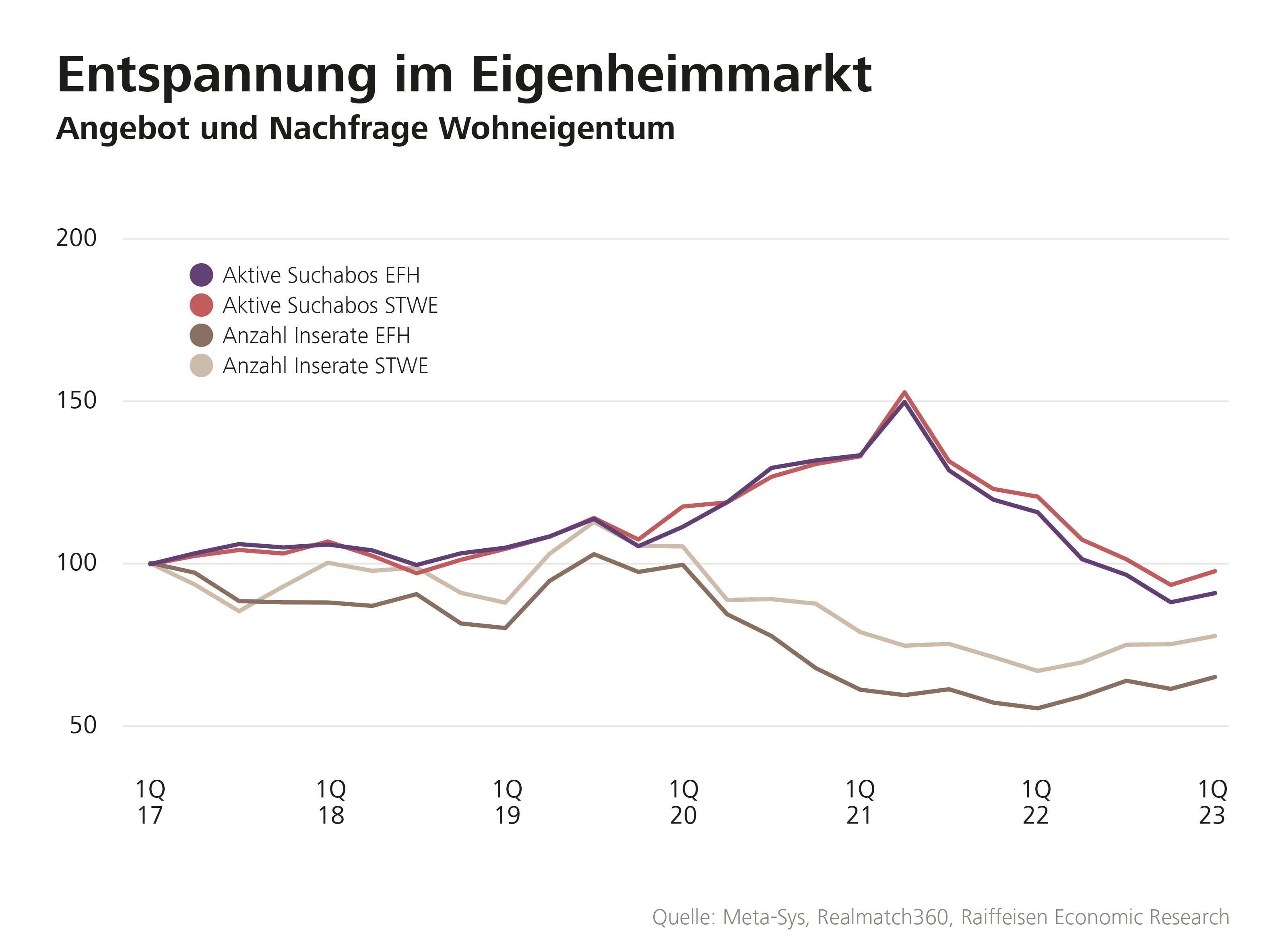Trotz Inflationssorgen und Zinswende steigen die Preise am Schweizer Eigenheimmarkt weiter. Im Vorjahresvergleich haben sich Einfamilienhäuser um 6,1 Prozent und Eigentumswohnungen um 7,5 Prozent verteuert. Nun mehren sich allerdings die Zeichen einer anstehenden Abkühlung an diesem zuletzt heiss gelaufenen Markt. Mit dem Attraktivitätsverlust von Wohneigentum gegenüber dem Wohnen zur Miete kann eine spürbare Abnahme der Nachfrage festgestellt werden. Seit dem Höhepunkt mitten in der Covid-19-Pandemie ist die Menge der Suchabonnements für Eigentumswohnungen um rund 36 Prozent und für Einfamilienhäuser um 39 Prozent zurückgegangen. Die Zahl der aktiven Abonnements ist mittlerweile sogar spürbar unter das Vor-Corona-Niveau gefallen. Aber auch angebotsseitig hat sich der während der Pandemie völlig ausgetrocknete Markt zuletzt wieder etwas erholt. Im Vergleich zu den Tiefstständen während der Coronapandemie werden aktuell wieder 17 Prozent mehr Einfamilienhäuser und 16 Prozent mehr Eigentumswohnungen, mehrheitlich aus dem Bestand, auf Onlineportalen zum Verkauf angeboten. Damit schliesst sich langsam die Schere zwischen Angebot und Nachfrage, die in den letzten Jahren für das Preiswachstum verantwortlich war. «Für mehr als eine Abschwächung der Preisdynamik dürfte es am Eigenheimmarkt aber nicht reichen. Grössere Preisrückgänge oder gar ein Crash bleiben aufgrund der weiterhin grossen Angebotsknappheit sehr unwahrscheinlich. Die Zeichen am Eigenheimmarkt stehen auf sanfte Landung», erklärt Martin Neff.