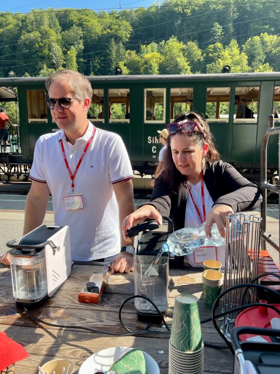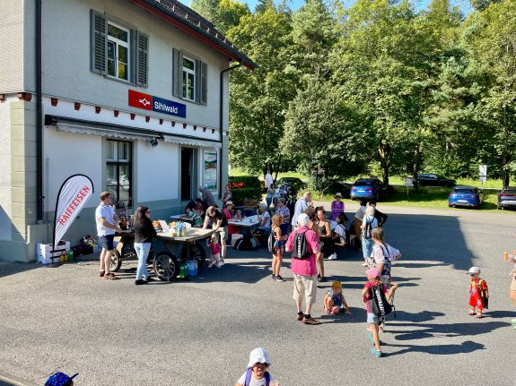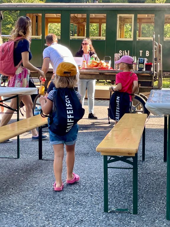 In den frühen Morgenstunden machten sich die Mechaniker vom Bahnhof Sihlwald auf den Weg zur «Schnaaggi-Schaaggi», um diese mit viel Liebe auf die bevorstehende Reise einzuheizen. Die Sonne strahlte und um 10.00 Uhr begrüssten wir unsere ersten Gäste. Die Lokomotive bestaunten sie mit leuchtenden Augen und sahen gespannt bei den Vorbereitungen zu. Frisch gestärkt dampfte die Loki um 11.10 Uhr los Richtung Zürich-Wiedikon. Anschliessend genossen die Passagiere den schönen Sihlwald, bevor die nostalgische Fahrt zu Ende ging. Mit einem feinen Spitzbub verabschiedete sich die Raiffeisenbank Thalwil von Klein und Gross.