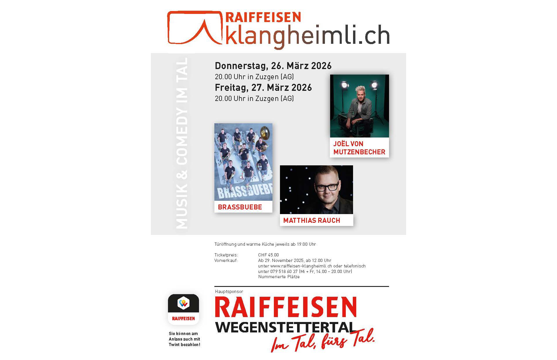 Das RAIFFEISEN-klangheimli.ch 2026 findet am Donnerstag, 26. März 2026, und Freitag, 27. März 2026, im Raiffeisen-Kulturzelt in Zuzgen statt.