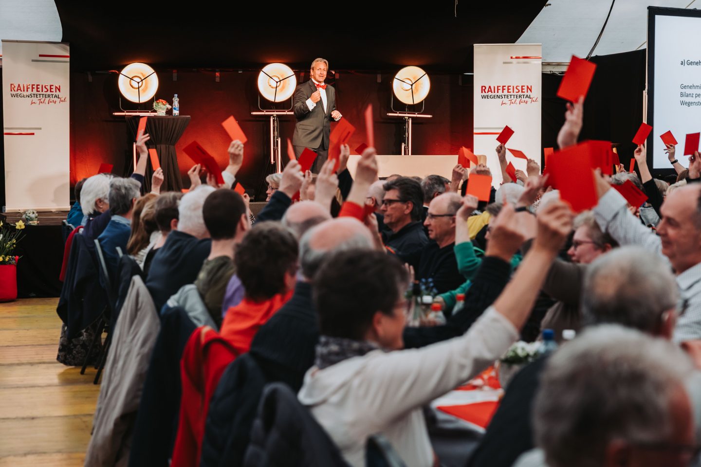 Am Samstag, den 29. März 2025, fand in Zuzgen die ordentliche Generalversammlung der Raiffeisenbank Wegenstettertal statt. Mit rund 450 anwesenden Personen war die Teilnahme beachtlich. Im Mittelpunkt standen die Zustimmung zur Verzinsung des Anteilsscheins mit 6%, das 100jährige Jubiläum der Bank, welches mit diversen Aktivitäten im 2026 gebührend gefeiert wird und natürlich das seit Monaten bestens gehütete Geheimnis des Abends mit den Überraschungsgästen «Kliby und Caroline». Alle Anträge des Verwaltungsrats, einschliesslich der Annahme des Jahresberichts und der erteilten Decharge an Verwaltungsrat und Bankleitung, wurden genehmigt.