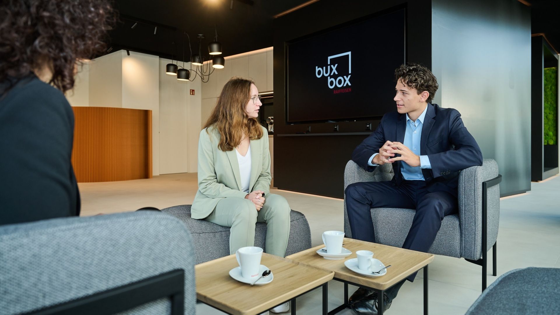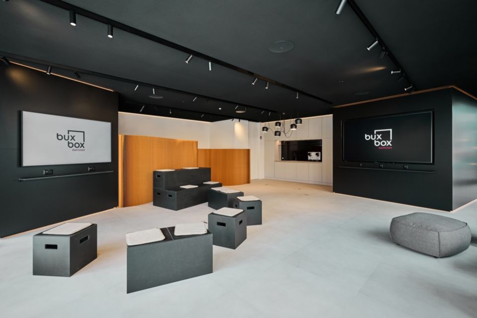 Die BuxBox bietet Platz für bis zu 50 Personen in Konzertbestuhlung und eine flexible Arbeitsumgebung mit sechs Arbeitstischen, Holzwürfeln mit Sitzpolstern, zwei Sitzlounges und zwei Sitzschaukeln.