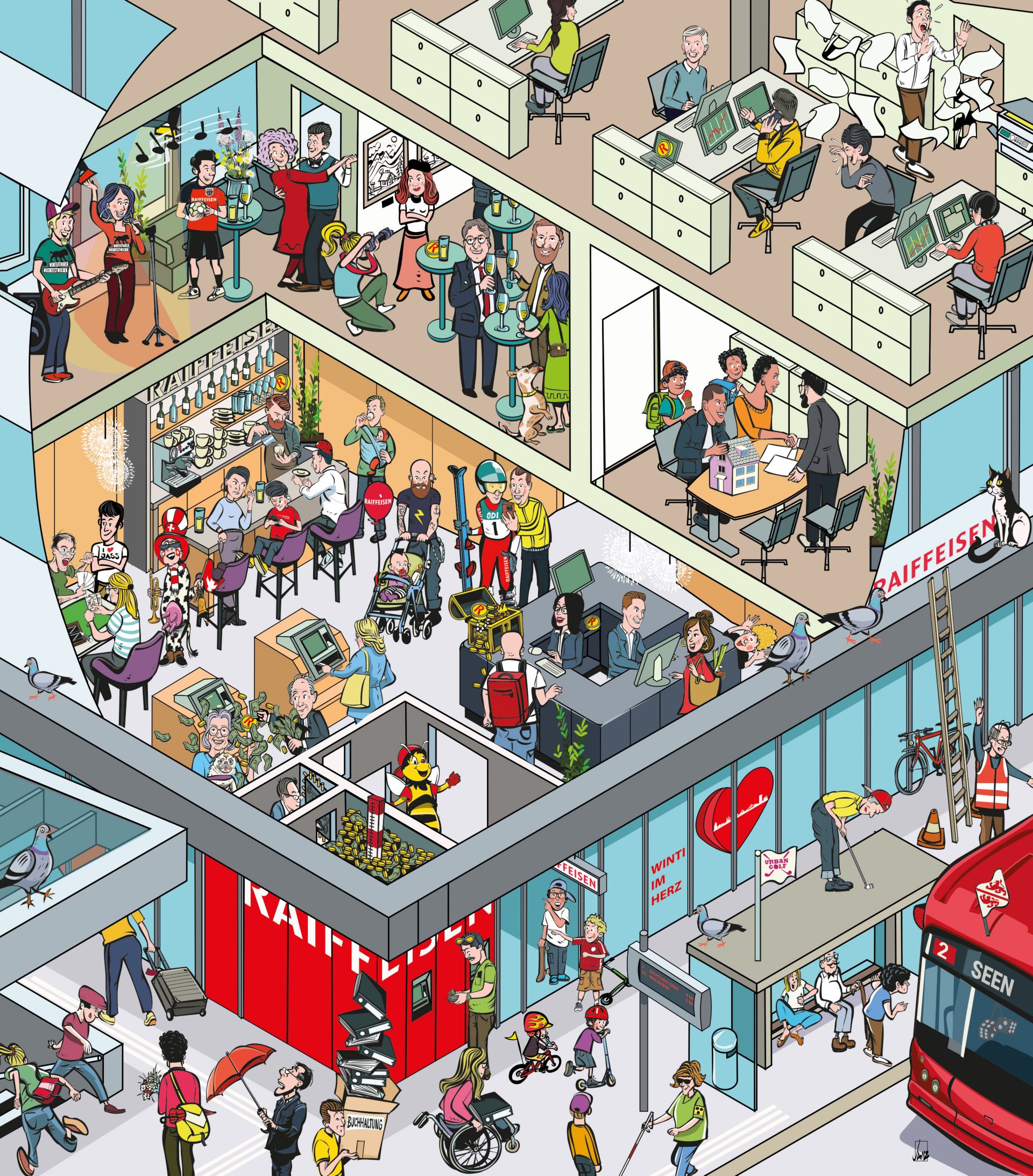 Finden Sie alle Raiffeisen-Münzen in unserem Wimmelbild und gewinnen Sie mit etwas Glück einen von drei 1g-Goldbarren.