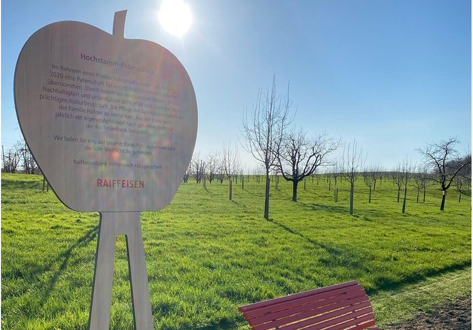 Im Rahmen eines Klimaschutzprojekts hat unsere Raiffeisenbank im 2020 eine Patenschaft für 40 Hochstamm-Apfelbäume übernommen.