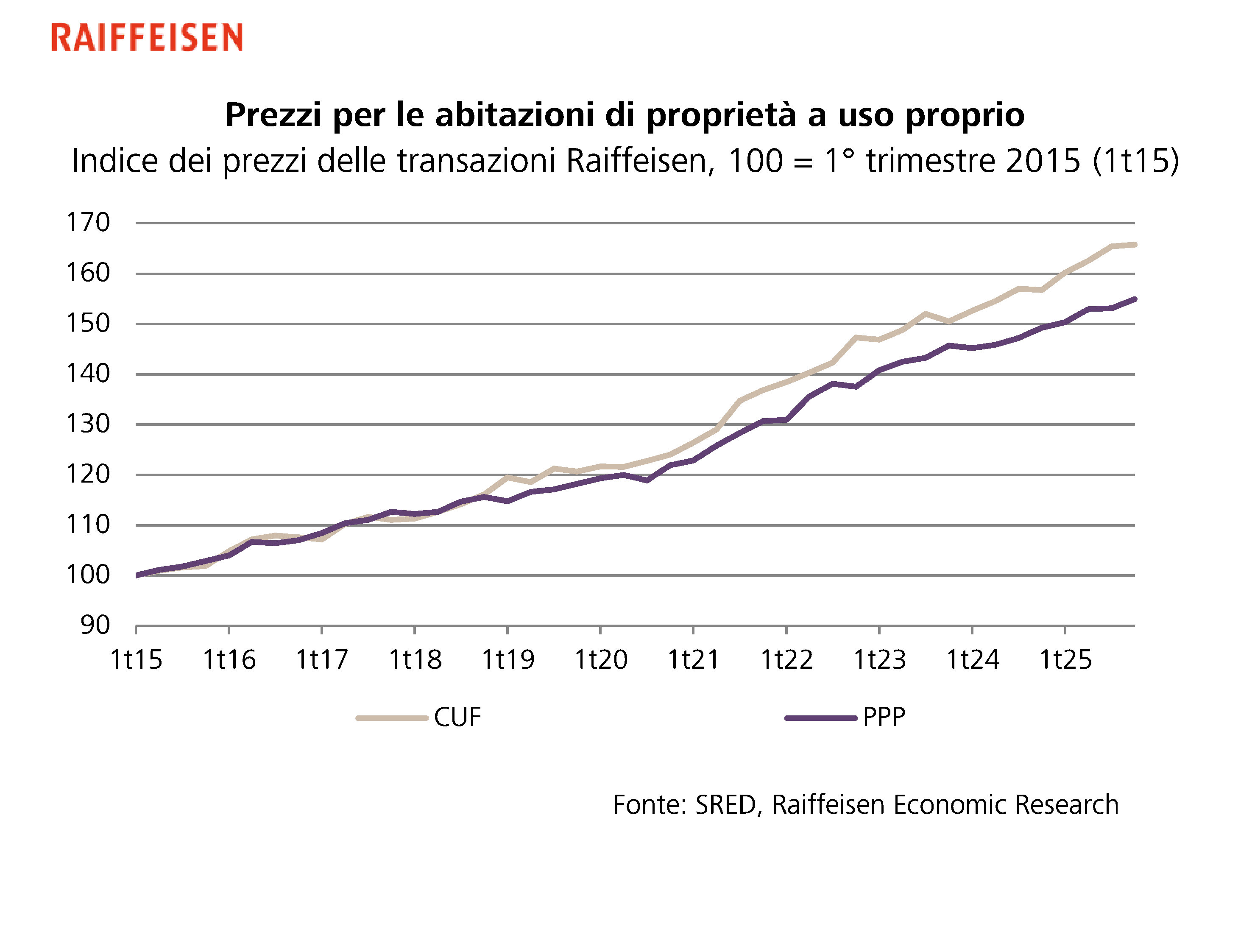 San Gallo, 12 gennaio 2026. I prezzi delle abitazioni di proprietà a uso proprio sono ulteriormente cresciuti nel quarto trimestre del 2025. Le case unifamiliari sono aumentate dello 0.2 per cento rispetto al trimestre precedente. Le proprietà per piani sono diventate più costose, con un aumento dell'1.2 per cento. Rispetto al quarto trimestre del 2024, le case unifamiliari costano ora il 5.7 per cento e le proprietà per piani il 3.8 per cento in più. «A differenza del mercato degli appartamenti in locazione, dove la crescita dei prezzi degli affitti si è recentemente attenuata a causa del calo dell'immigrazione, la dinamica dei prezzi nel mercato delle abitazioni di proprietà, fortemente influenzato dalla domanda interna, rimane persistentemente elevata», spiega Fredy Hasenmaile, Economista capo di Raiffeisen Svizzera.