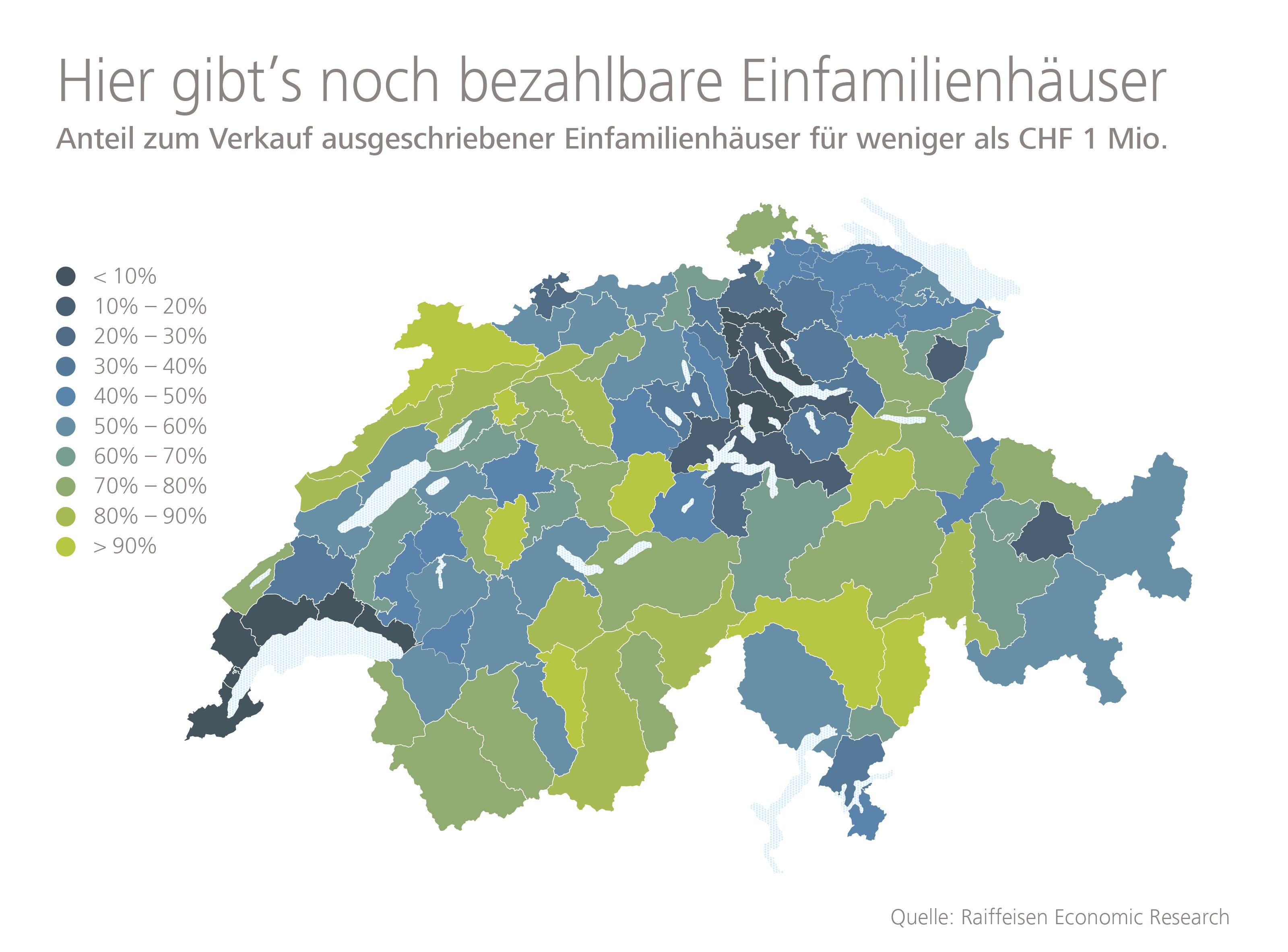 In der Schweiz gibt es aber durchaus noch bezahlbare Immobilien zu kaufen. So waren 30 Prozent aller Ende September 2021 auf Internetportalen ausgeschriebenen Einfamilienhäuser für weniger als 750'000 Franken, 13 Prozent sogar für weniger als 500'000 Franken zu haben. «Trotz Rekordpreisen gibt es in der Schweiz nach wie vor bezahlbare Einfamilienhäuser. Nur halt nicht an den Toplagen. Häuser in Gemeinden mit unterdurchschnittlicher Standortqualität sind aber kaum gefragt. Der Markt spielt an den guten Lagen», stellt Martin Neff, Chefökonom von Raiffeisen Schweiz, fest.