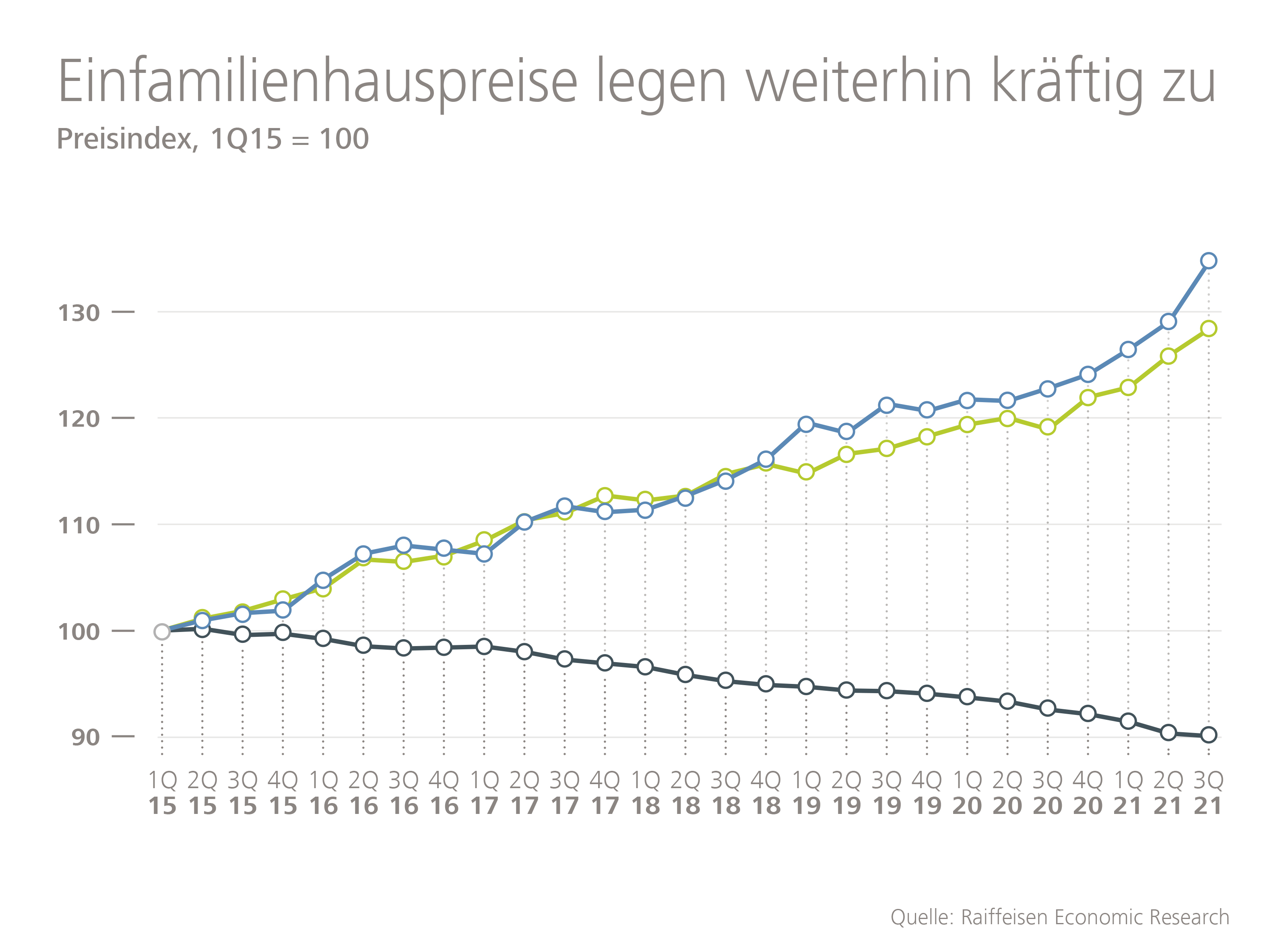 St.Gallen, 10. November 2021. Die Preise für selbstgenutztes Wohneigentum haben im dritten Quartal 2021 erneut Rekordstände markiert. Stockwerkeigentum wurde 2,0 Prozent teurer gehandelt als im Vorjahr. Die Preise für Einfamilienhäuser stiegen mit 4,4 Prozent so stark wie nie seit der Lancierung des Raiffeisen Transaktionspreisindex.