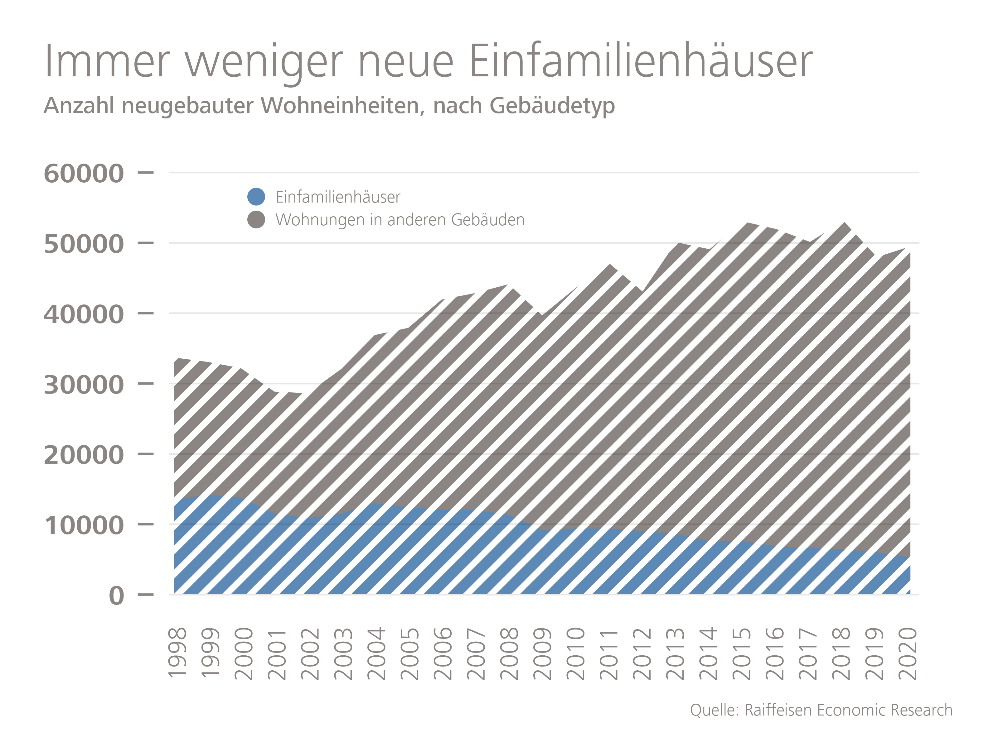 Aufgrund der strengen raumplanerischen Vorschriften ist bebaubarer Boden in der Schweiz ein äusserst knappes und gefragtes Gut. Zwar entstehen viele neue Wohnungen nach wie vor auf der grünen Wiese. Der Trend in der Bauwirtschaft geht aber klar in Richtung Verdichtung. Im Jahr 2000 wurden noch 43 Prozent der Neubau-Wohneinheiten in Einfamilienhäusern erstellt. 2020 waren es nur noch knapp 11 Prozent. Stattdessen werden immer mehr vergleichsweise platzsparende Etagenwohnungen in immer grösseren und höheren Mehrfamilienhäusern gebaut.